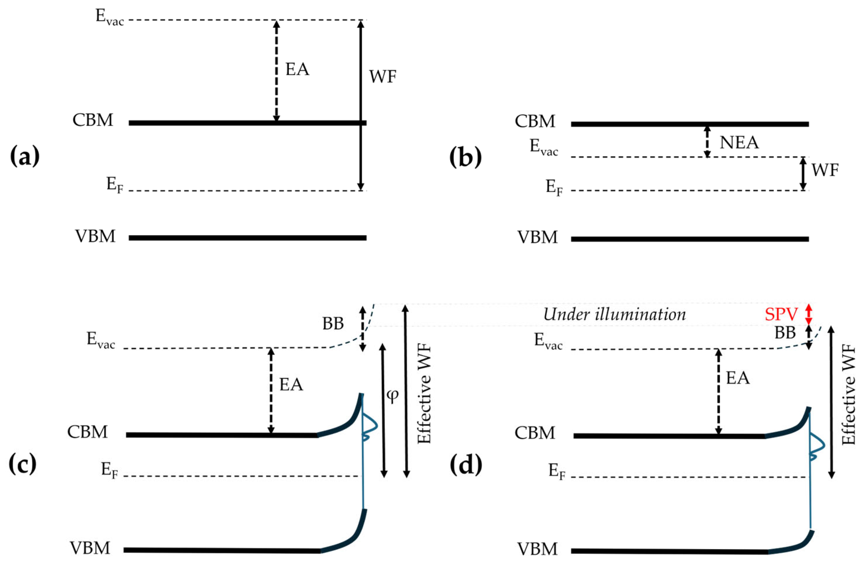 - Surface dipoles and adsorbates: At the material surface or interface, a dipole layer (for example, due to adsorbed alkali metals, molecules, or an atomically thin coating) shifts the vacuum surface potential, thereby lowering (or raising) WF [24,25]. Carefully engineered surface dipoles can reduce WF down to 2–3 eV.