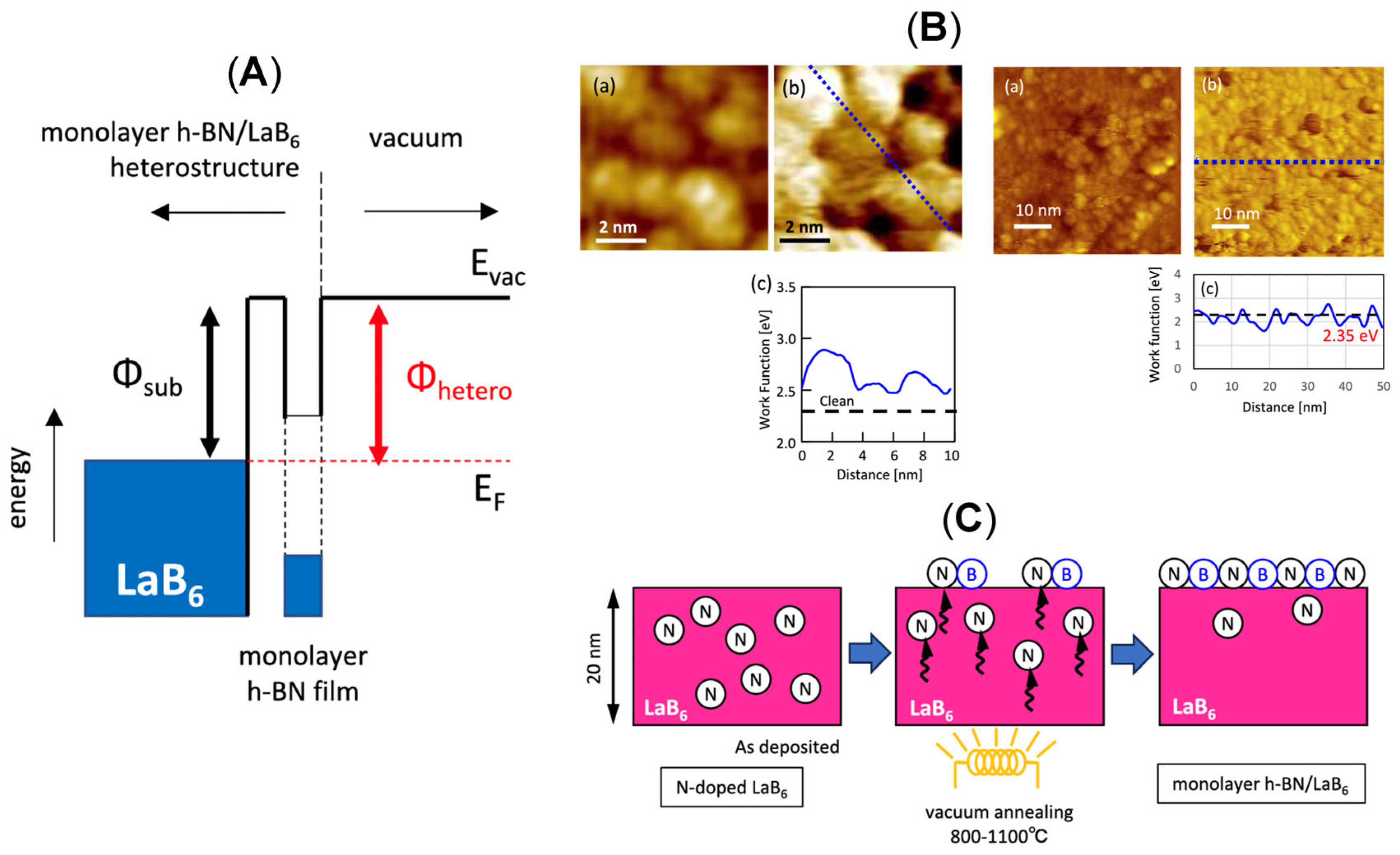 - Nagaoka, K.; Aizawa, T.; Ohmi, S.-I. Fabrication of monolayer h-BN/LaB6 heterostructure thin film with low work function and high chemical stability. Appl. Surf. Sci. 2024, 669, 160478. [Google Scholar] [CrossRef]