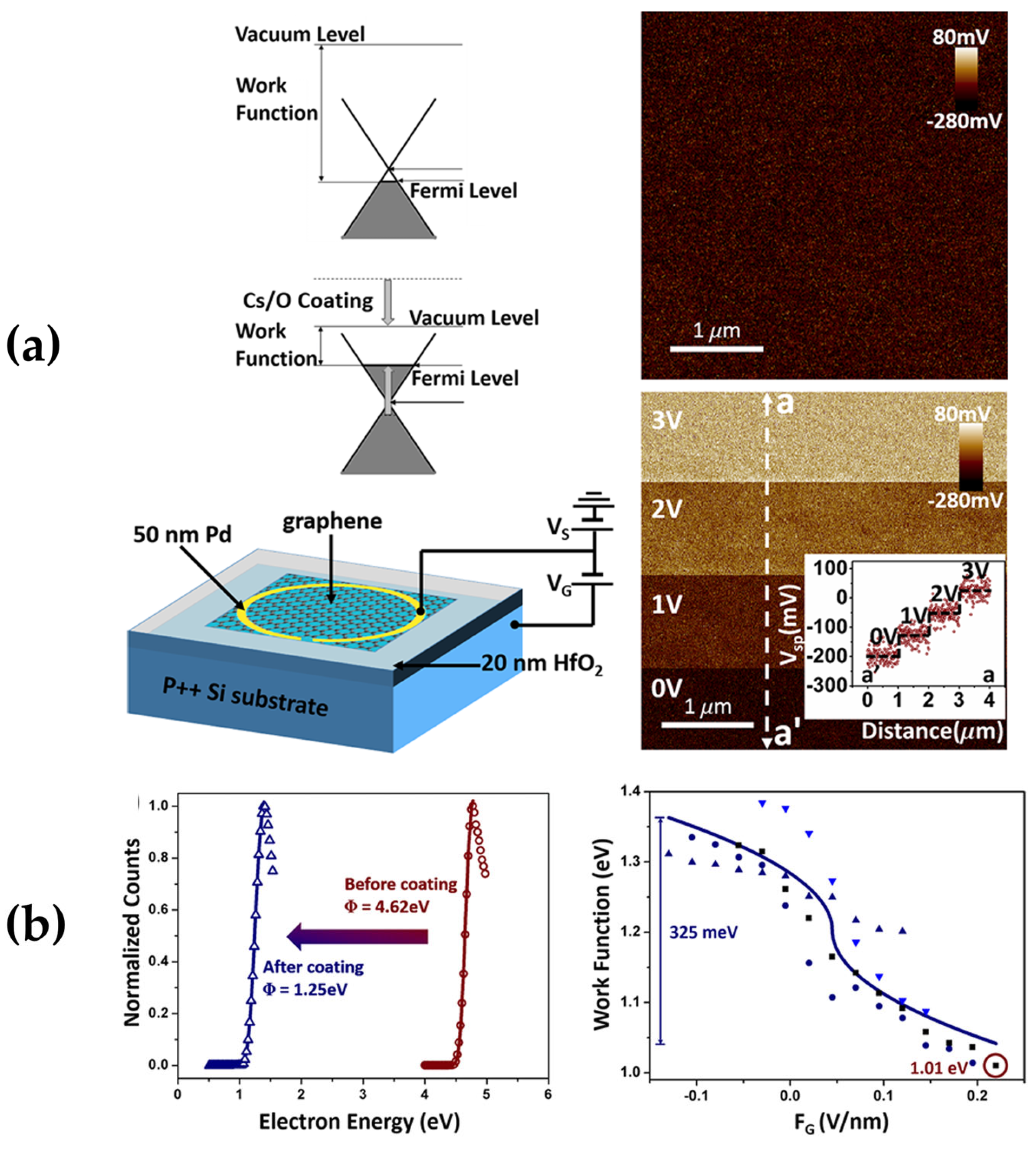 | Cs/O on graphene | 1.25 | 0.08 eV | Experimental [41] | Photoemission low-energy cutoff (LEC). WF = 1.32 eV measured with KFPM at ambient conditions. If back-gated, WF decreases to 1.01 ± 0.05 eV. |
