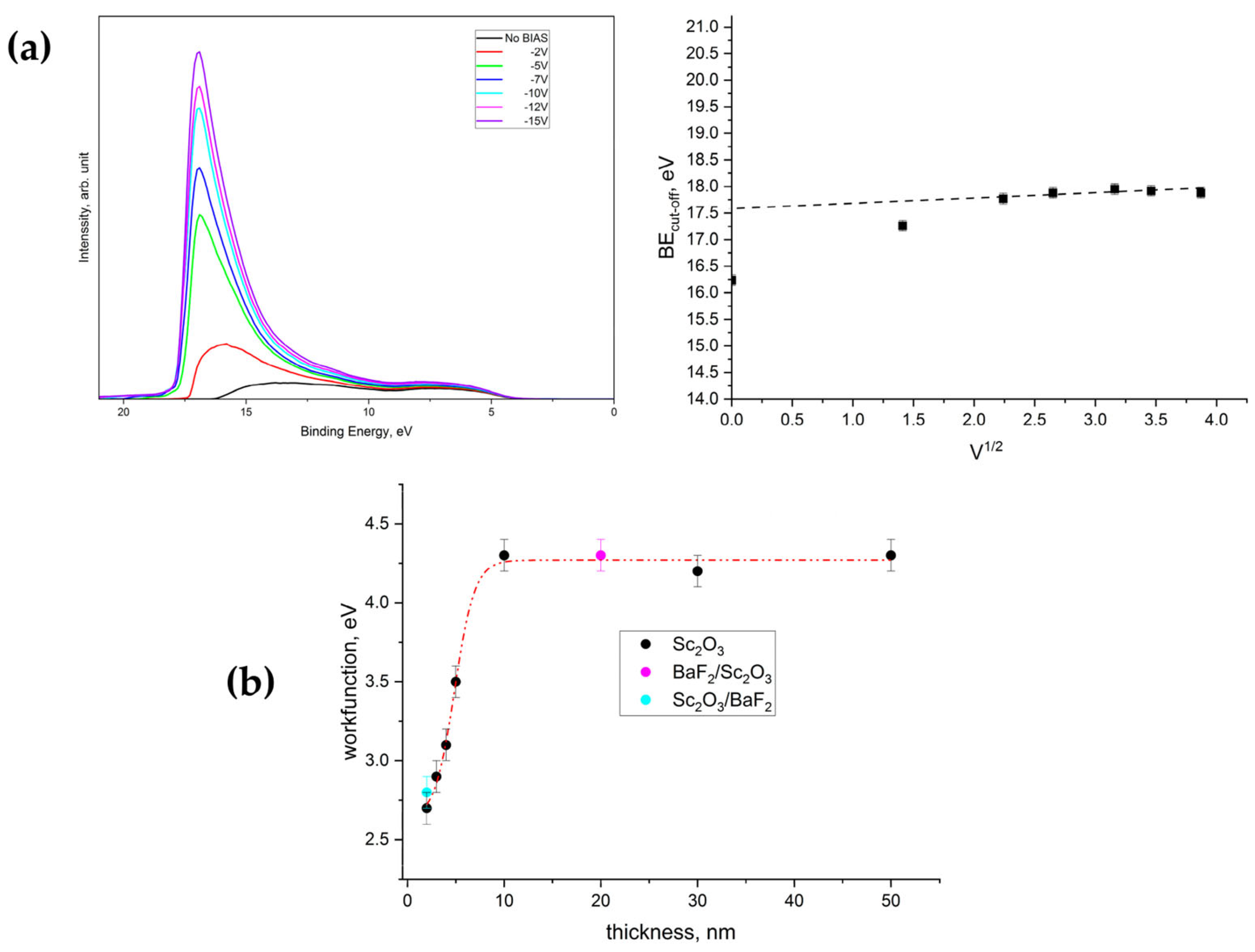 - Experimental methods: UPS can measure the difference between the vacuum level and the Fermi energy by analyzing the cut-off of emitted photoelectrons under ultraviolet excitation [83]. However, Helander et al. note important pitfalls [84], in that UPS typically measures the minimum WF (i.e., the lowest WF patch on an inhomogeneous surface) rather than an average, and measurement geometry (sample-detector alignment) and contamination critically influence the result. KPFM methods measure contact potential difference between a reference tip and the sample surface, enabling the mapping of WF variation across surfaces and operation in ambient or controlled atmospheres [85]. Nonetheless, tip WF drift, surface contamination, and stray fields must be carefully calibrated. Recently, an in-depth treatment of measurement artifacts, patch fields, and electric-field effects on measured WF values has been reported [37]. Field/thermionic emission experiments infer an effective WF from the temperature- or field-dependent emission current [86]; these methods reflect device-level performance but are influenced by surface morphology, local fields, and non-idealities. Based on these considerations, it is important to make a note regarding the experimental methods. Figure 7 provides a representative example of best practices in UPS-based WF measurements on semiconducting oxides. In particular, the application of a controlled bias voltage during cutoff acquisition minimizes spurious zero-field effects and charging-related distortions, enabling a more reliable determination of the equilibrium work function. This approach is consistent with established methodologies developed to mitigate measurement artifacts in complex semiconductor and dielectric stacks, as discussed in detail in the work of Martinez et al. [87]. Finally, it is important to underline that, when comparing reported WF values, best practices should include clearly specifying surface preparation, measurement environment (ultra-high vacuum vs. ambient), temperature, and uncertainty, as well as distinguishing between equilibrium WF and effective WF or illumination-assisted emission barriers. Such reporting is essential to ensure meaningful comparison across materials and techniques.