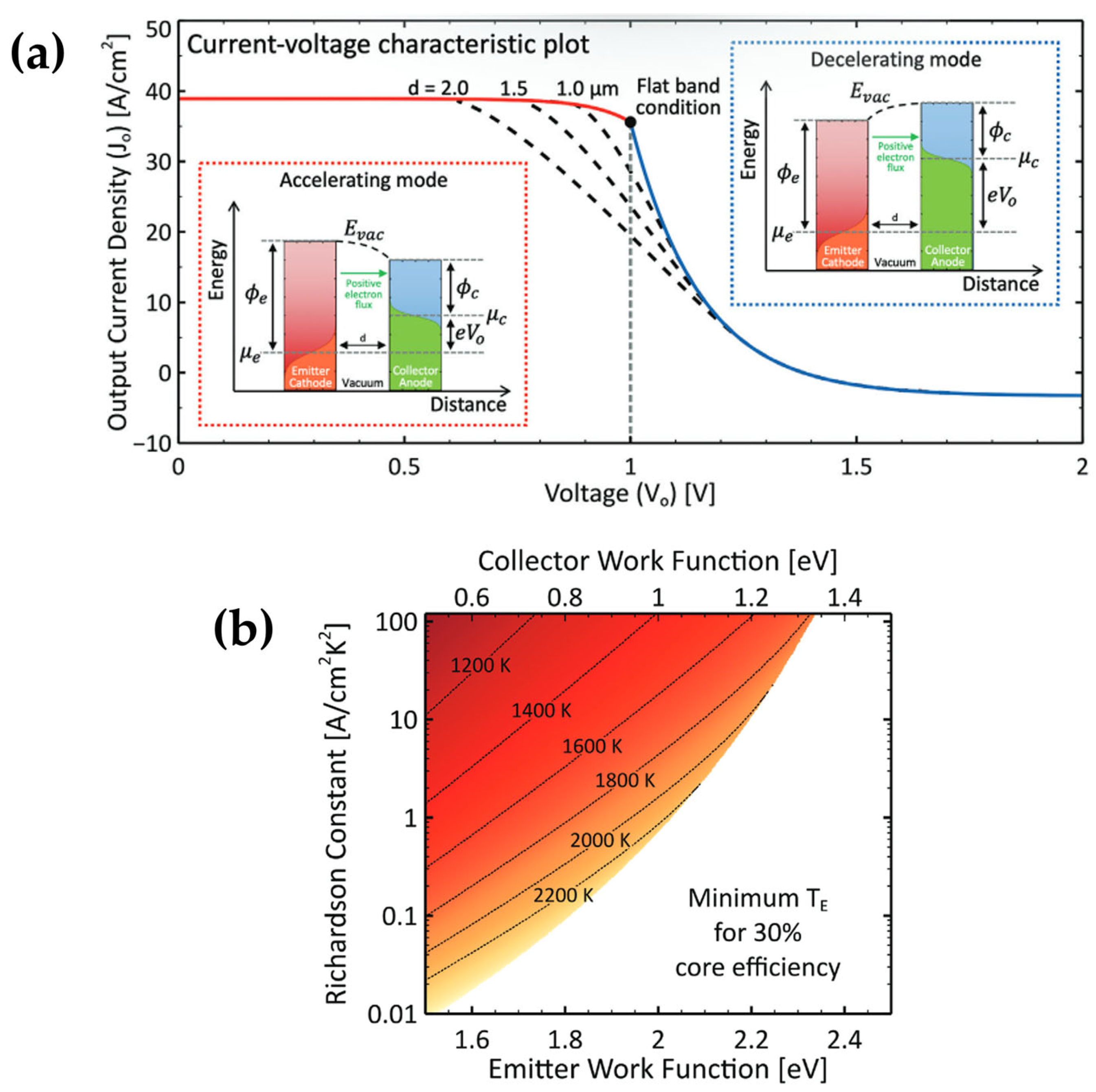- Campbell, M.F.; Celenza, T.J.; Schmitt, F.; Schwede, J.W.; Bargatin, I. Progress Toward High Power Output in Thermionic Energy Converters. Adv. Sci. 2021, 8, 2003812. [Google Scholar] [CrossRef]