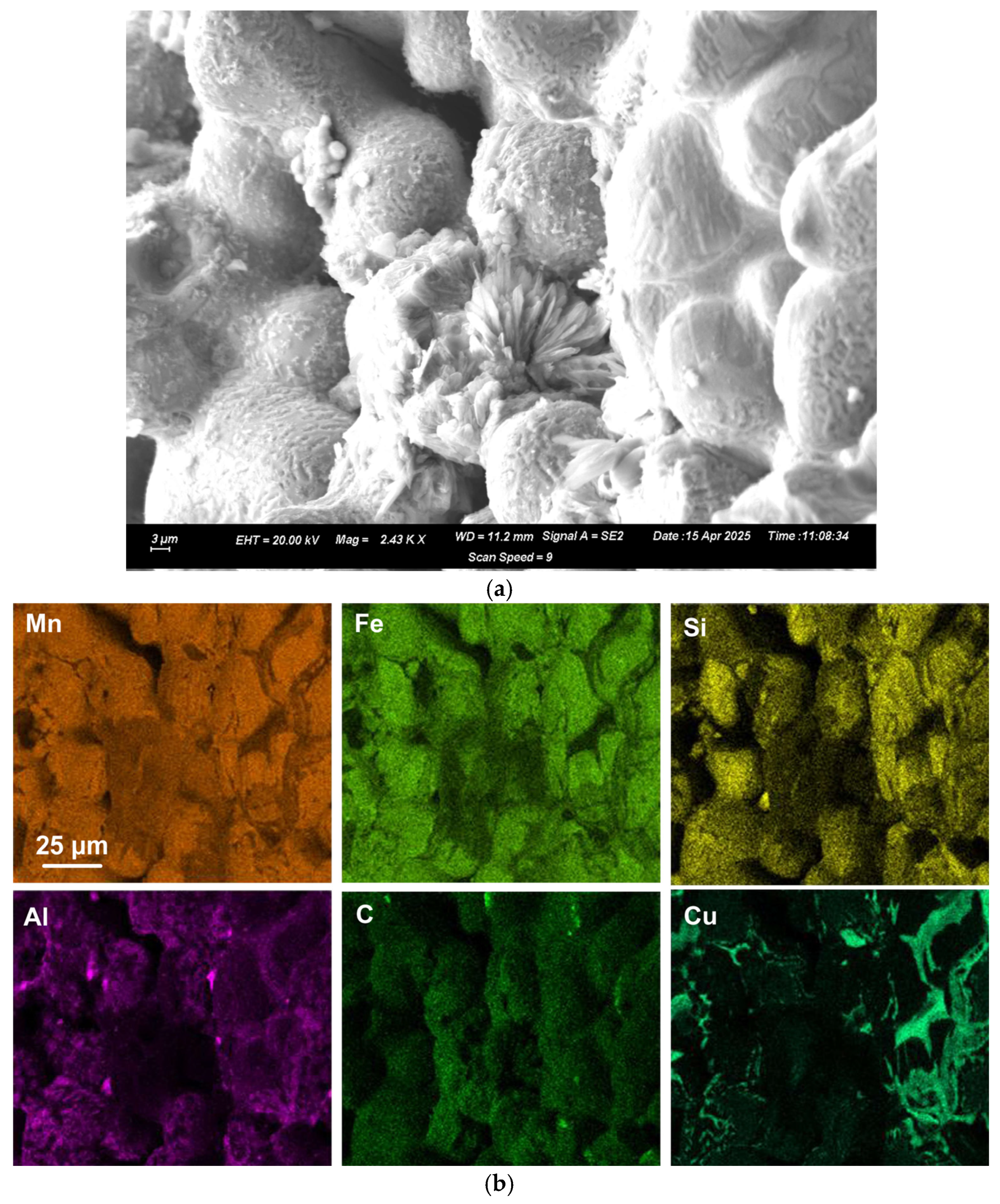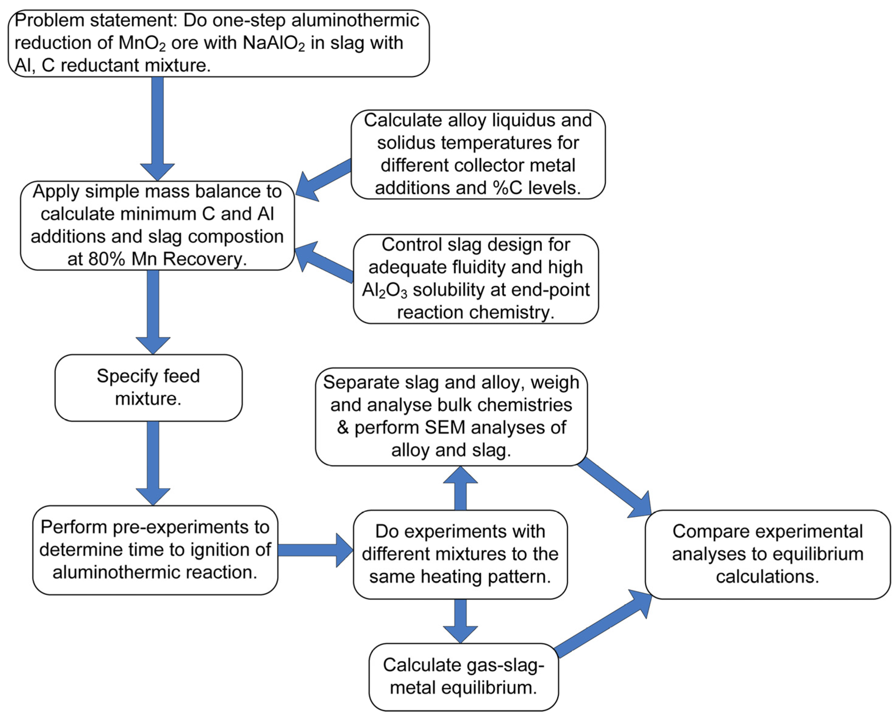 In summary, this work demonstrates that a sodium-fluxed slag with high Al2O3 solubility can be utilised in the aluminothermic reduction in MnO2 ore using Cu as a collector metal and adding a minor carbon reductant quantity. The addition of a carbon reductant negates MnO2 ore pre-roasting step. The Cu collector metal increases the Mn recovery to the alloy by 6%. The feed mixture formulation yields a NaAlO2-containing slag suitable for leaching to recover aluminium for circular processing, thereby providing a feed to the Hall–Héroult electrochemical process. A medium-carbon Fe–Mn–Si–Al–Cu complex ferroalloy is formed, which is suitable as a ferroalloying additive in steelmaking.
