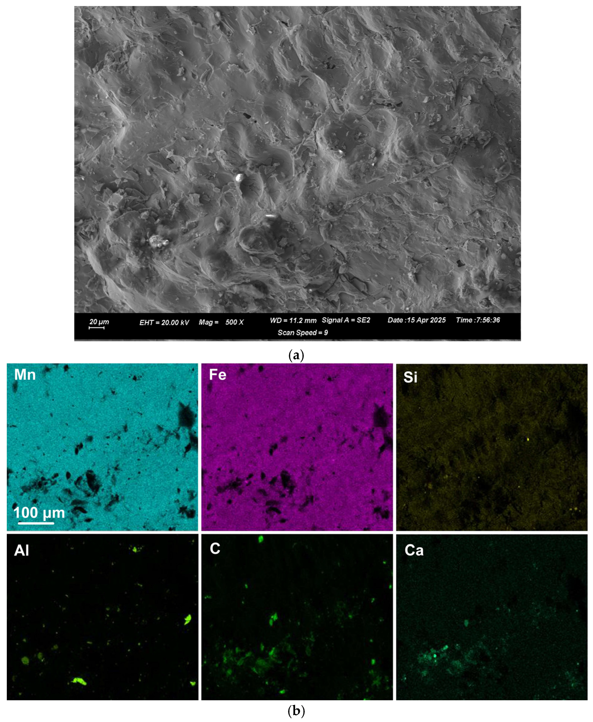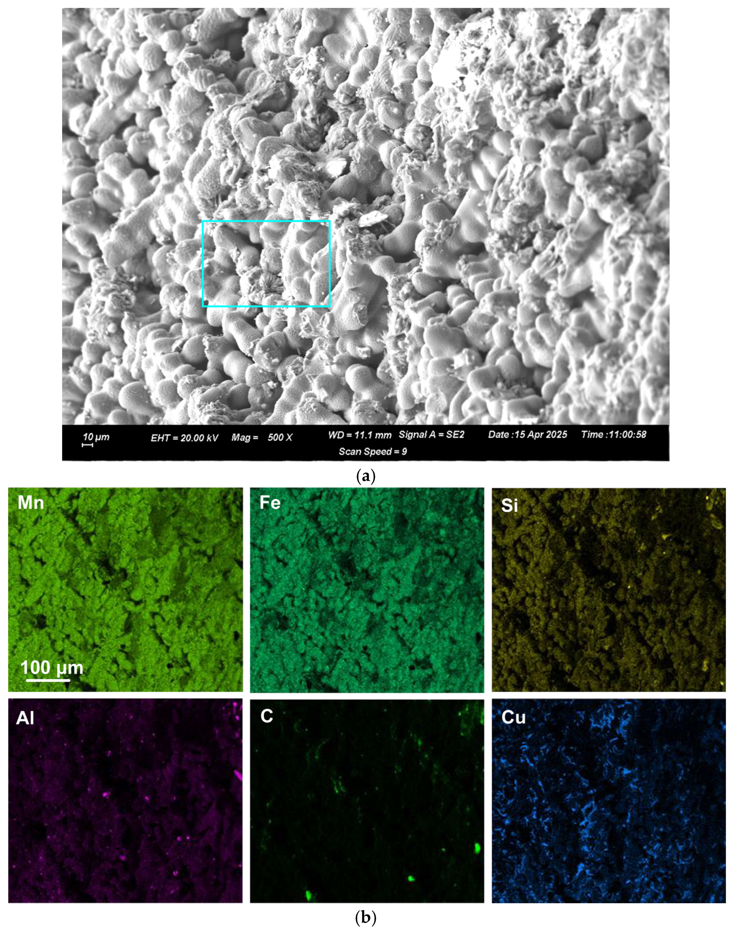 Figure 11a–d as a function of temperature, and the element distribution of Mn, Si, and Al for Sample A are shown in