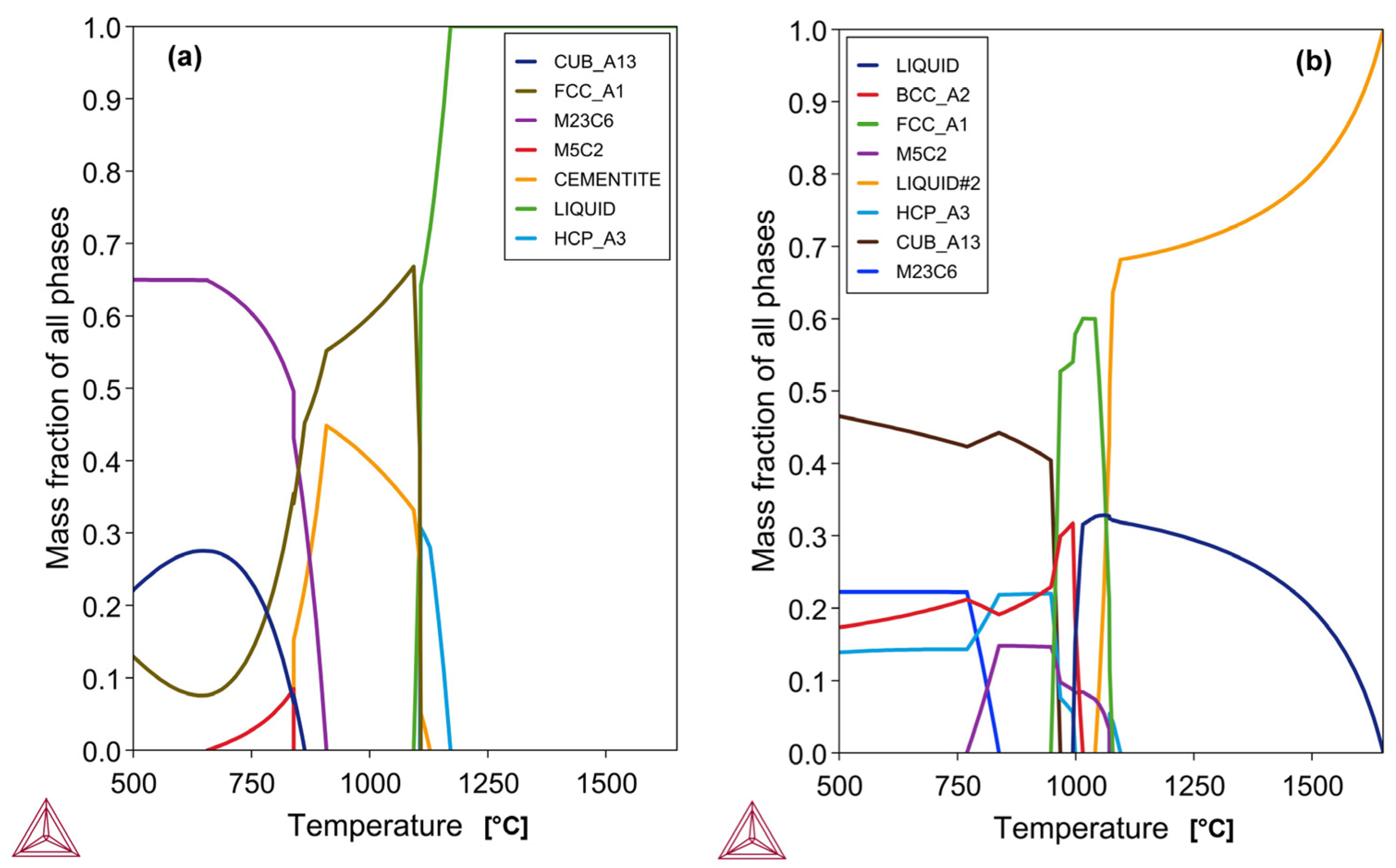 The equilibrium phase chemistry of the bulk alloy compositions is displayed as cooling graphs in