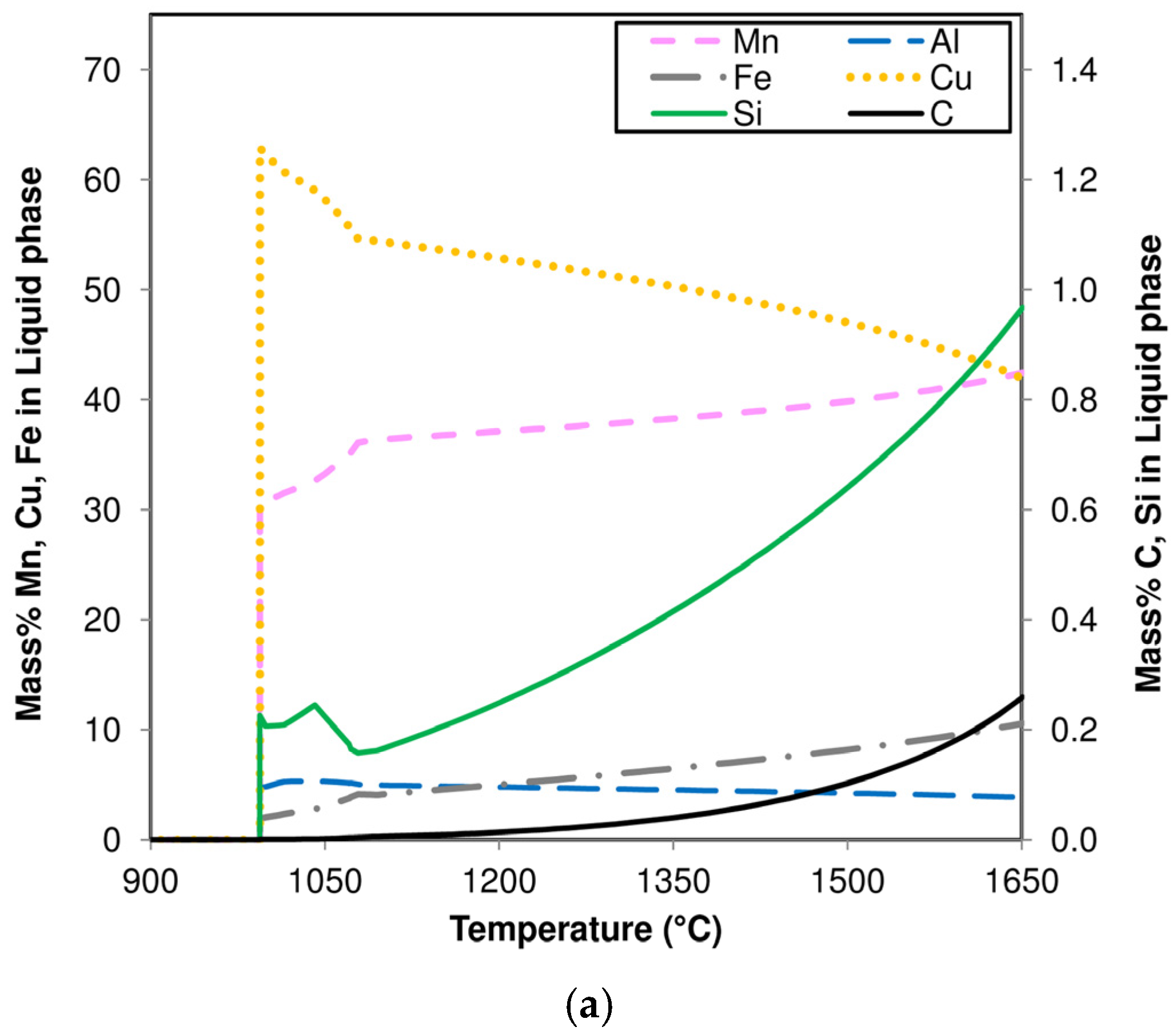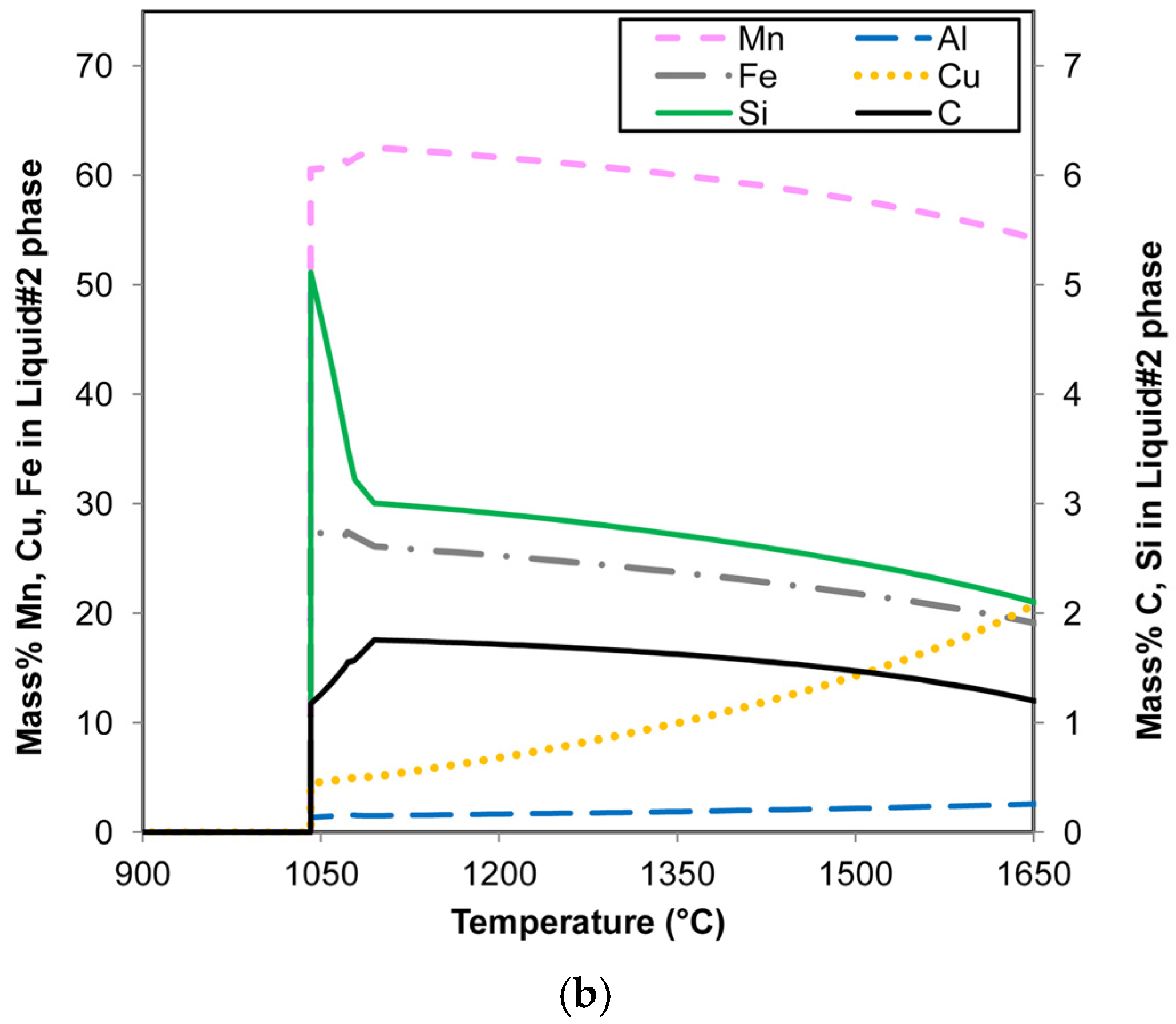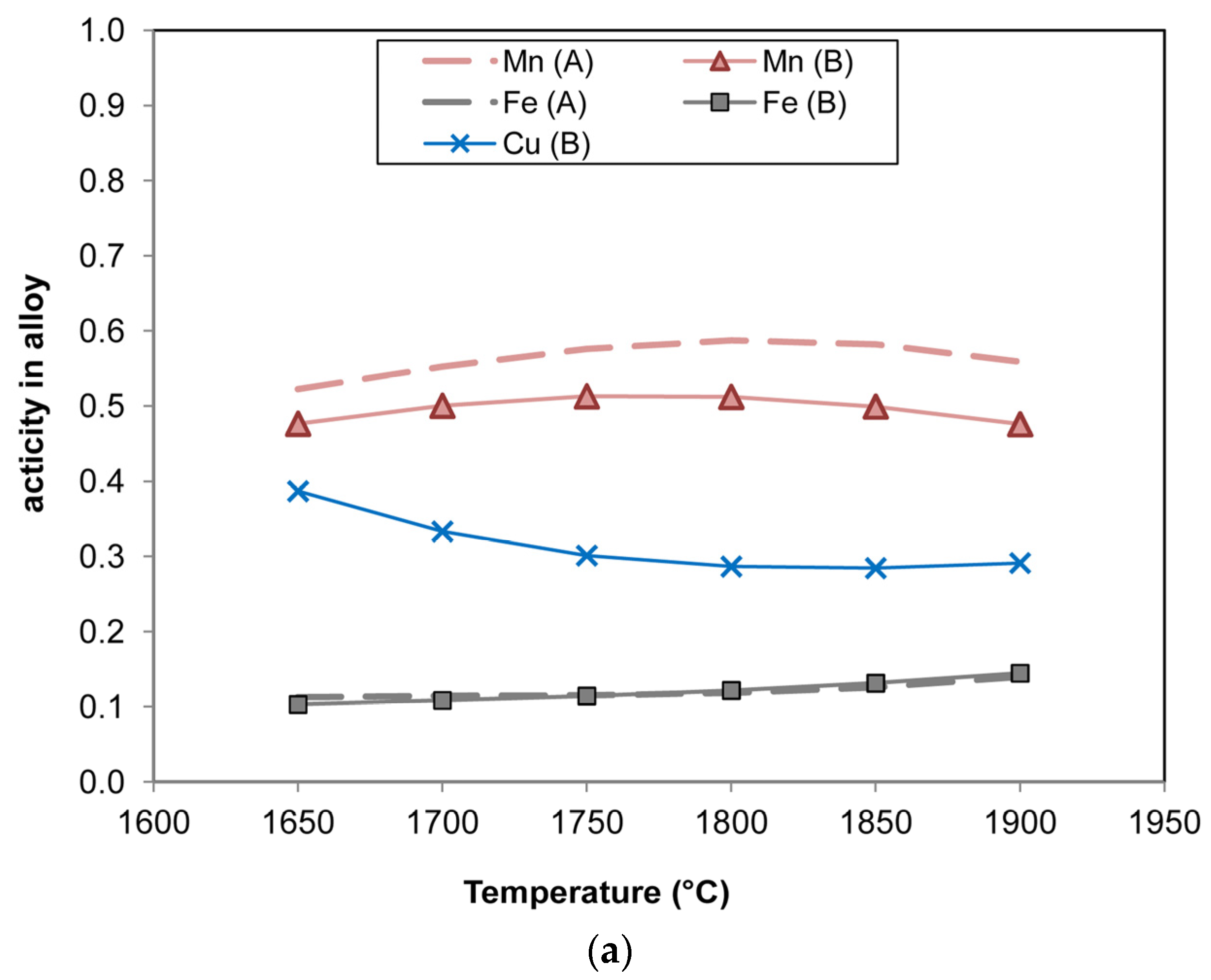 Figure 13a,b shows the equilibrium activities in the bulk alloy products. The main difference is the lowered activity of Mn in Sample B due to the addition of Cu. According to Le Chatelier’s principle, lowering the Mn activity will increase the driving force of reaction (2) towards completion [