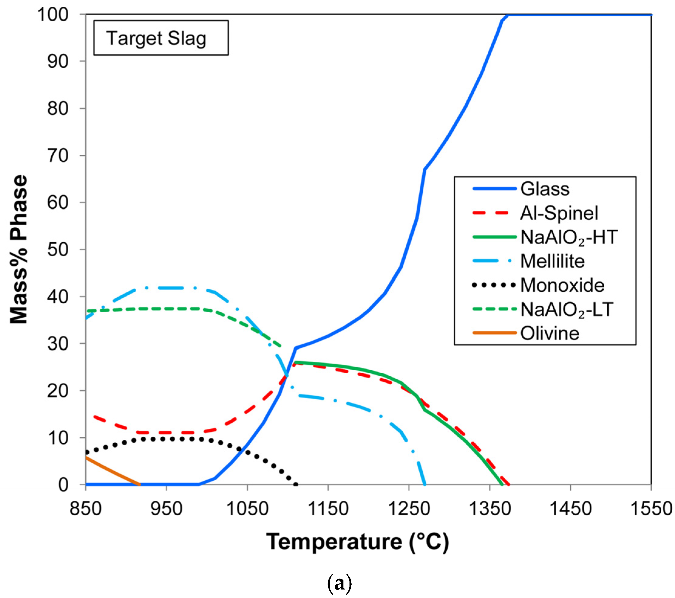 Figure 8a,b shows the cooling curves of the target slag composition and the SEM–EDX average analysis of slag B (
