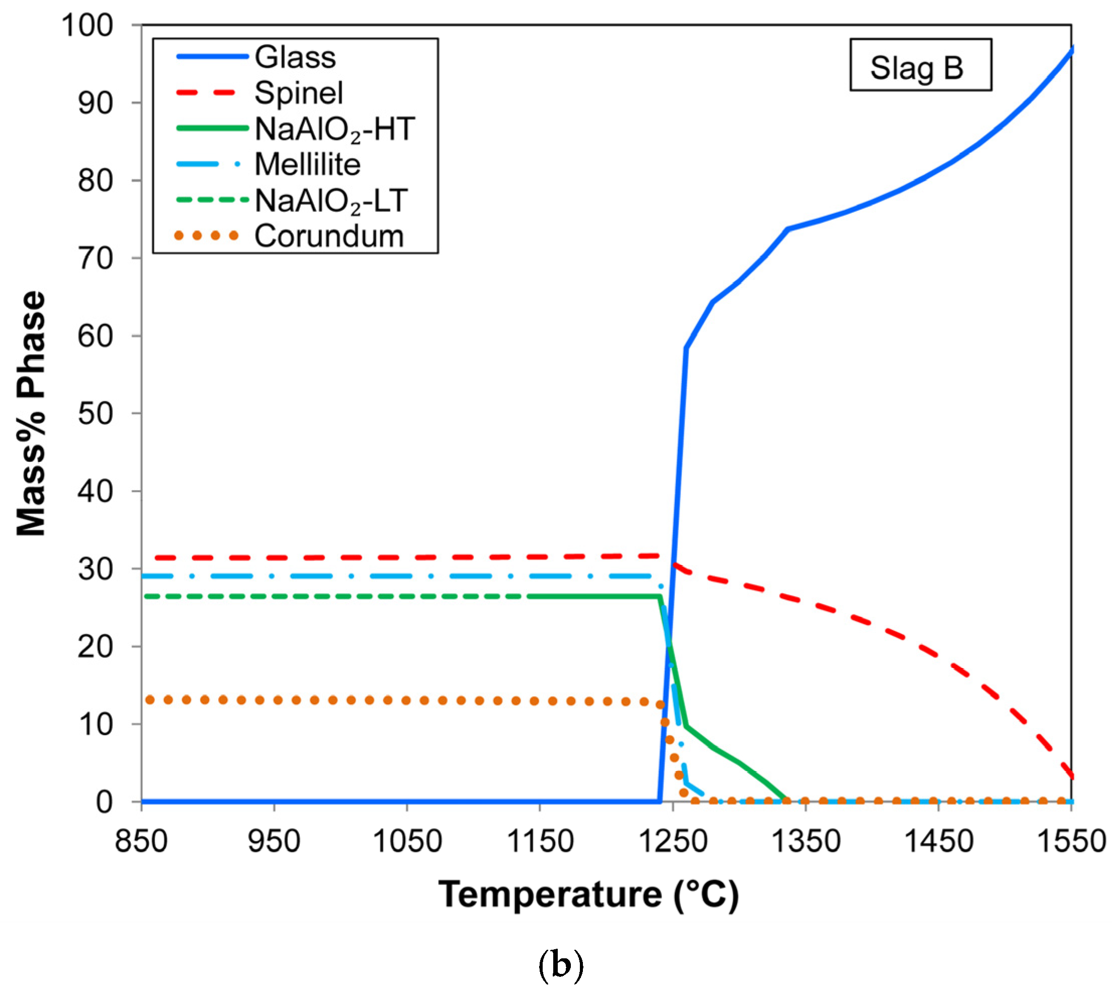 Figure 10c,d displays the slag compositions in comparison to the equilibrium lines at 1650–1900 °C. The equilibrium lines for Sample A and Sample B slag are the same since the copper metal added in Sample B is inert with respect to the slag components. It is seen that the %Al