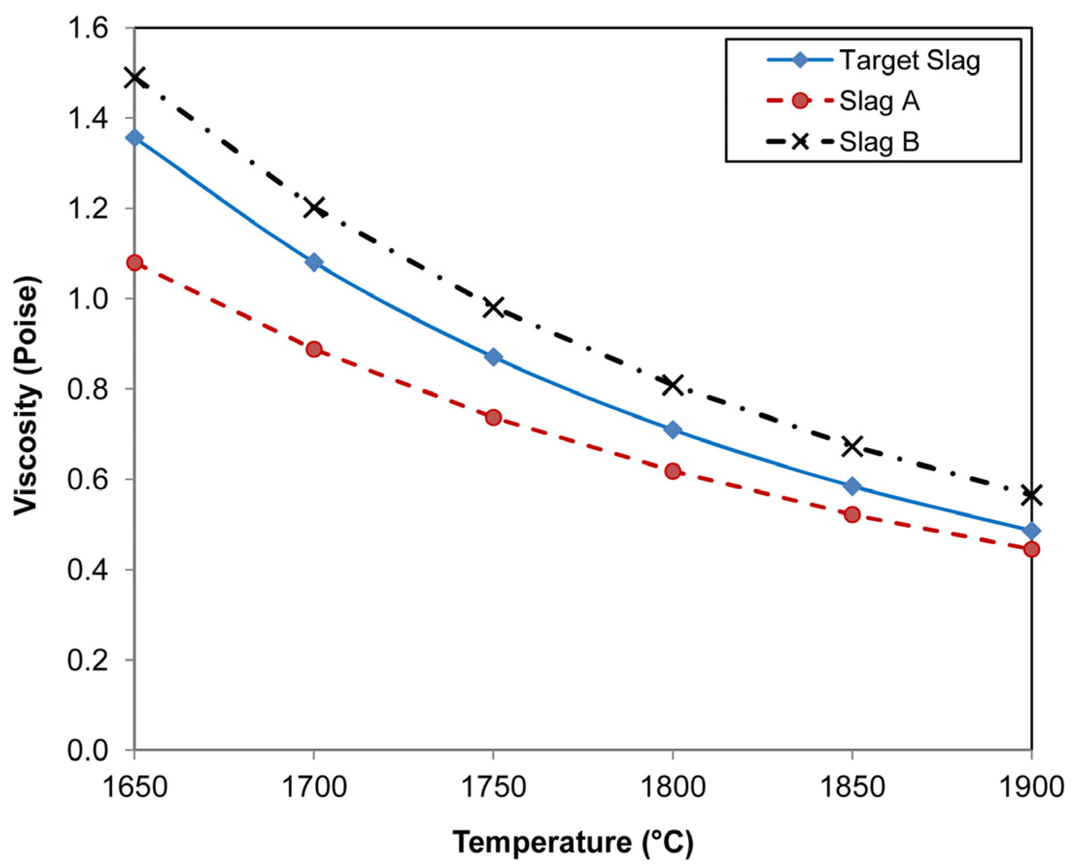 3 in slag B, 55%, leads to the formation of the spinel phase as the primary solidification phase. The slag liquidus temperature is higher at 1564 °C compared to the target slag liquidus temperature of 1373 °C. This aspect does not appear to be problematic at the high temperatures expected in aluminothermic reduction. The calculated slag viscosities of the fully liquid slags are compared in