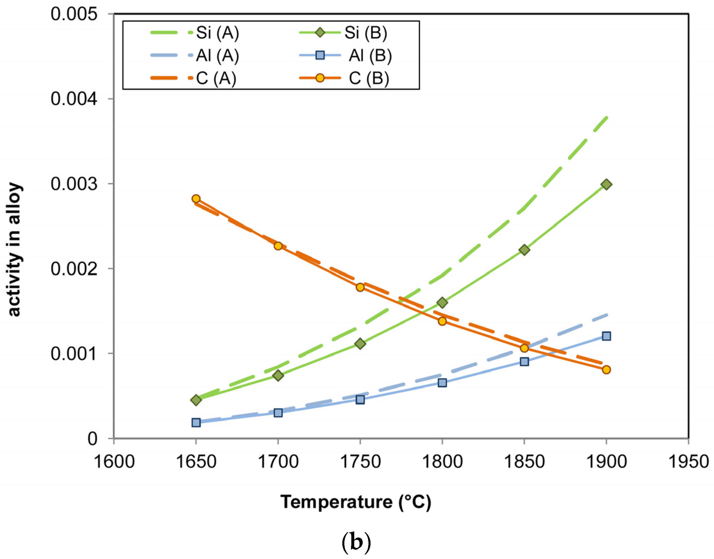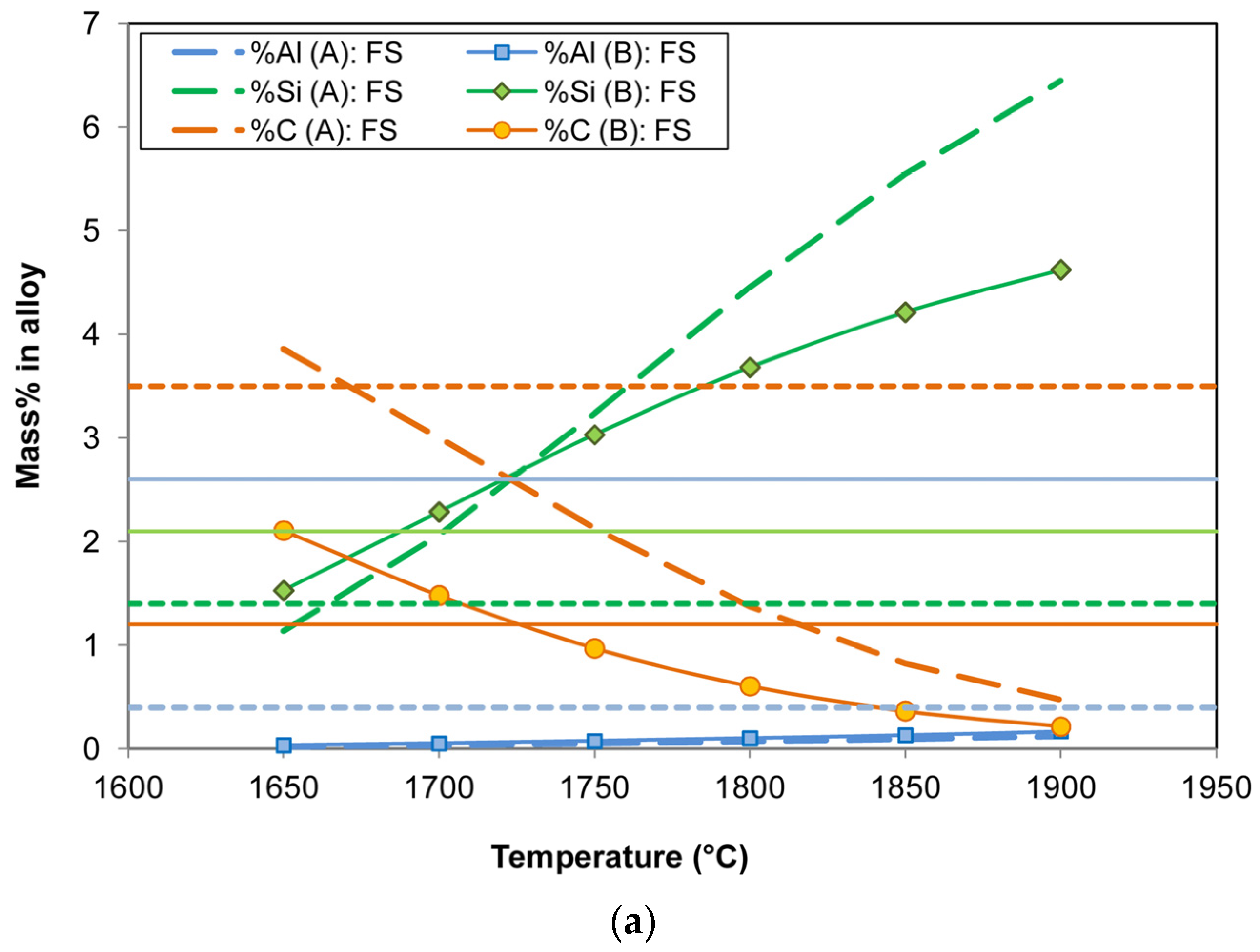 Figure 12b shows a higher distribution of Si to the alloy in Sample B (by 3–5%) at 1650 °C compared to 1700 °C.
