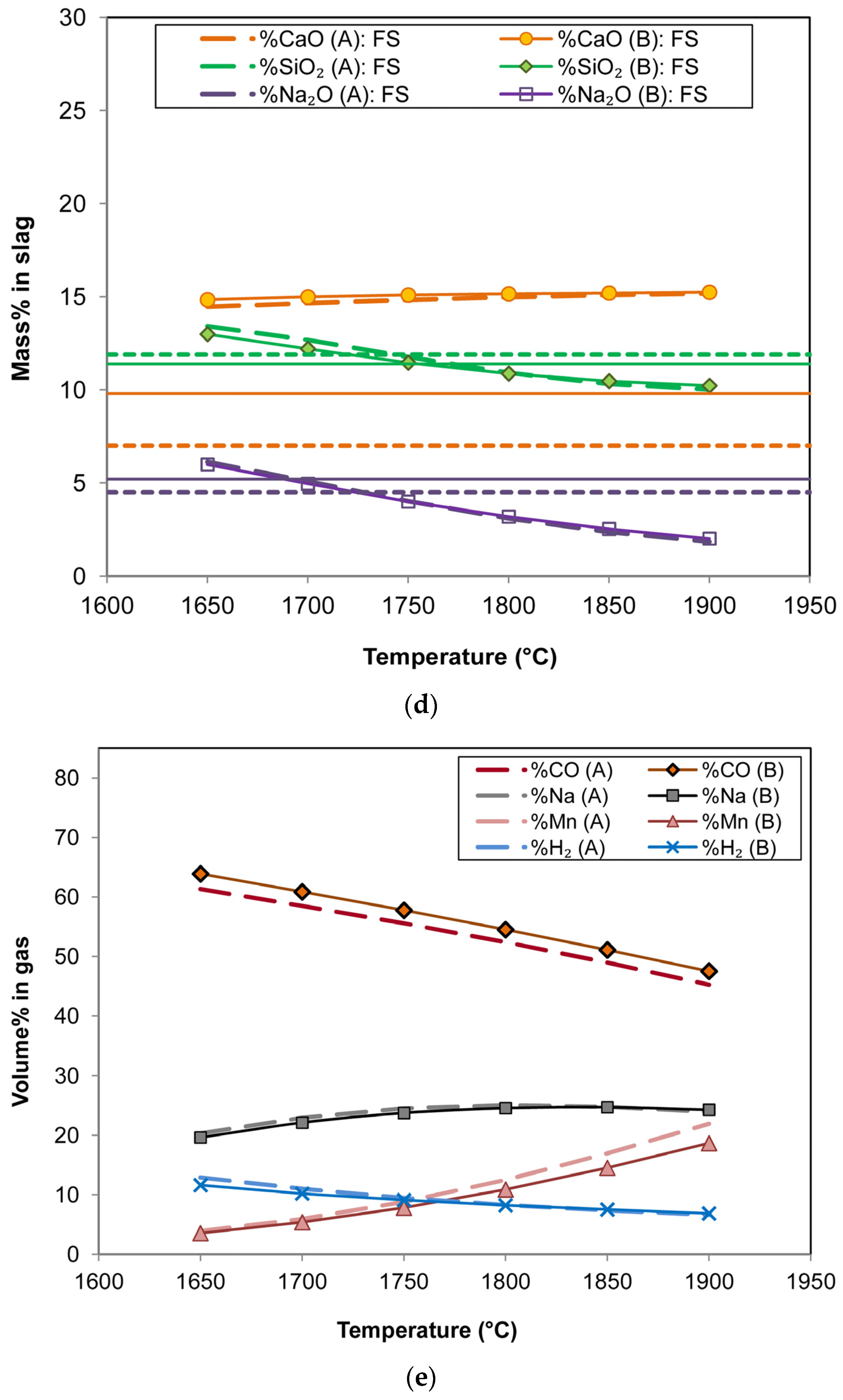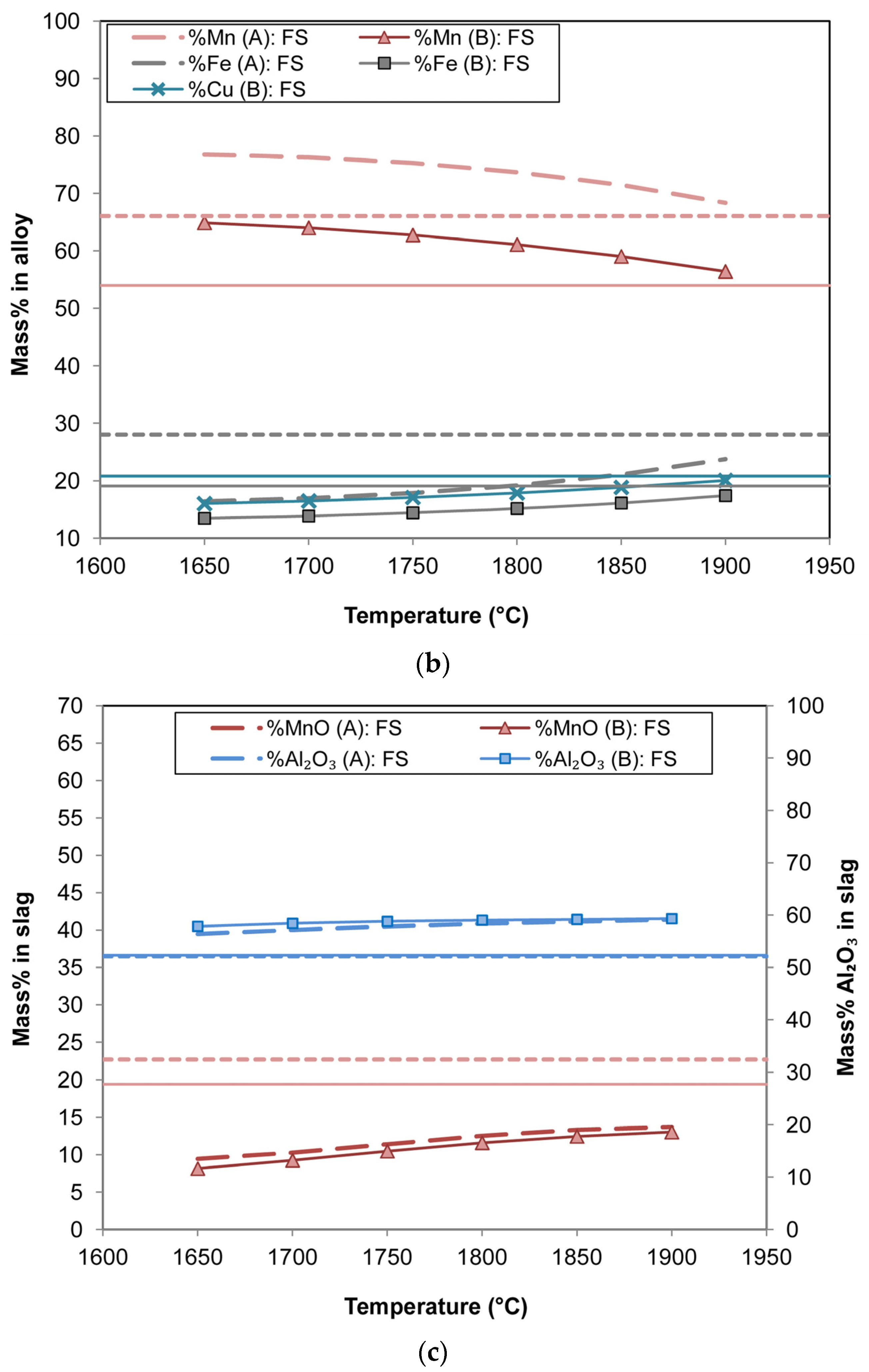 The gas–slag–metal equilibrium for the feed mixture inputs was calculated at temperatures of 1650 °C–1900 °C. The calculated equilibrium end-point alloy and slag analyses for Samples A and B are compared to the experimentally determined values, as shown in