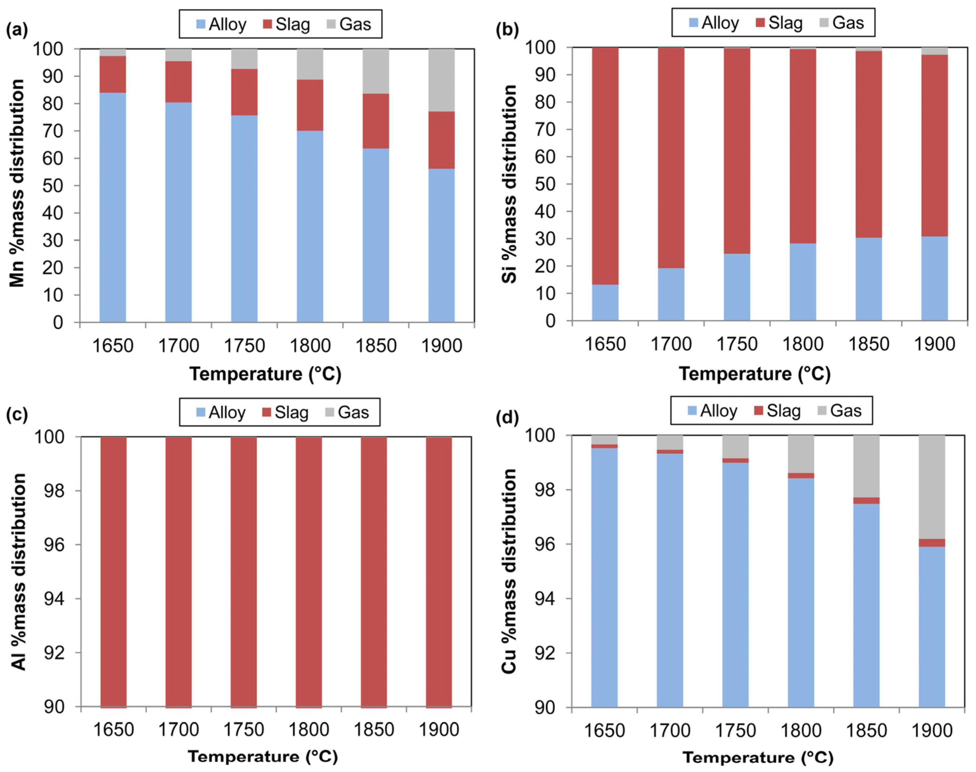 Copper distribution to the alloy is high, being 100% at 1650 °C and 96% at 1900 °C, with an increased loss to the gas phase as the temperature increases. Since Cu is inert to oxidation, there is no oxidation loss to the slag phase. Comparing