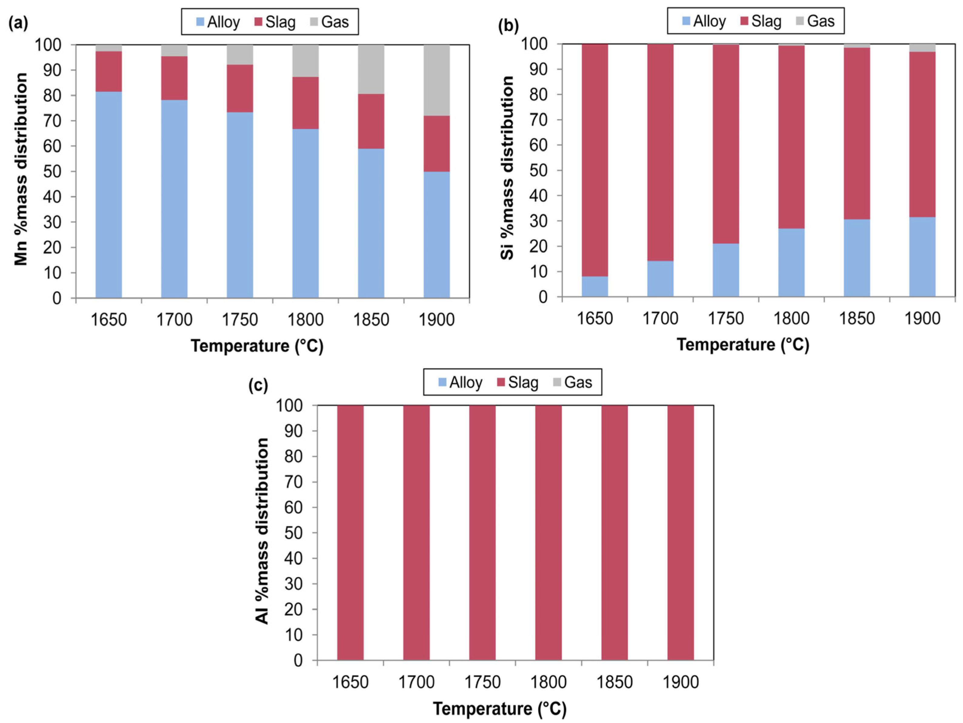 The FactSage-calculated gas–slag–metal mass distribution of the elements Mn, Si, Al, and Cu for Sample B is summarised in