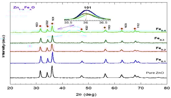 The XRD patterns of Zn1−xFexO NPs are presented in Figure 2. For pure ZnO NPs, x = 0, one can observe sharp peaks positioned at 2θ ~31.6°, 34.3°, 36.1°, 46.8°, 56.0°, 62.5°, and 67.4° corresponded to the hexagonal wurtzite ZnO structure, associated with P63mc (card number 96-900-8878) [35]. The observed peaks are then indexed to the (100), (002), (101), (102), (110), (103), and (112) planes, respectively. The sharpness of the XRD peaks indicates a well-defined crystalline structure, while the absence of unknown peaks confirms the purity of the synthesized ZnO NPs. The XRD pattern of Zn1−xFexO (with x ≥ 0.1) nanocomposites displays similar sharp diffracted peaks; however, their sharpness decreases as x increases, implying a decrease in crystallinity. Further, (101) peak position and broadening are slightly altered as the Fe content increases, suggesting the doping of Fe ions in the ZnO structure probably induces changes in the crystal size as well as the lattice spacing. It should be noted that the spinel phase ZnFe2O4 has characteristic peaks at 2θ ~35.23°, 56.60°, and 62.14° assigned to 311, 333, and 440 planes [28], which might be a reason for the observed slight peak shifting and broadening.