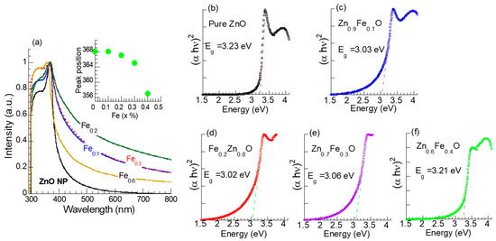 UV–Vis absorption spectroscopy was employed to examine the optical characteristics of both pristine and Fe-doped ZnO nanostructures. As shown in Figure 5a, the absorption spectra of the synthesized ZnO-based nanostructures exhibit pronounced absorption in the ultraviolet region (below 400 nm), which can be attributed to the intrinsic bandgap absorption of ZnO [8,29]. The UV absorption peak shifted from 3.67 to 3.56 nm (or 3.67 eV to 3.56 eV) as Fe content increased up to x = 0.4 (inset of Figure 5a), potentially due to a Moss–Burstein-type shift in the absorption edge [44,45]. Fe-doped ZnO (Zn1−xFexO) samples with x ≥ 0.1 also showed stronger absorption in the visible spectrum (λ > 400 nm) relative to the undoped ZnO, with the absorption increasing in the order Fe0.2 > Fe0.3 > Fe0.1 > Fe0.4, highlighting the critical role of Fe content in modulating the optical response of Zn1−xFexO nanostructures.