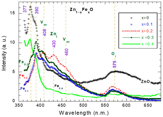 The PL spectra of Zn1−xFexO (x ≤ 0.1–0.3) exhibit emission humps at 408, 430, and 460 nm in the violet-blue region, which are commonly assigned in the literature to zinc vacancies (VZn), oxygen vacancies, and interstitial zinc (Zni) [49]. Although the exact origin of visible luminescence in ZnO remains a subject of ongoing debate [50], in this context, the observed violet-blue emissions may be tentatively associated with shallow defect introduced by Fe2+/Fe3+ substituting at Zn2+ lattice sites, which can induce local lattice distortion and alter the defect landscape of the ZnO host. At a higher Fe content (x = 0.4), both the UV and visible emissions reduced, likely due to the formation of Fe–Fe clusters that suppress radiative transitions [51]. These variations indicate modifications in the band structure and defect states of Zn1−xFexO due to Fe incorporation, which is consistent with the band gap changes (Figure 5b–f).