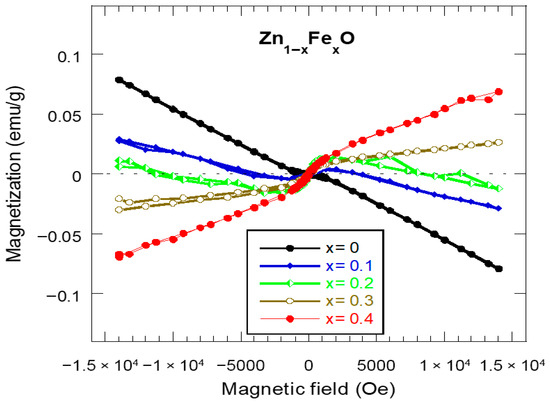 The magnetic properties of Zn1−xFexO nanostructures (x = 0.0, 0.1, 0.2, 0.3, and 0.4) were examined at room temperature using a vibrating sample magnetometer (VSM) under an applied magnetic field of ±15 kOe. After subtracting the diamagnetic contribution of the sample holder, the resulting magnetization (M–H) curves are presented in Figure 7. Pristine ZnO NPs exhibit a diamagnetic response similar to bulk ZnO. Upon Fe incorporation, the Zn0.9Fe0.1O sample displays a combination of diamagnetic behavior at high fields and weak ferromagnetic features in the low-field regime. With further increase in Fe content (x ≥ 0.2), the M–H curves show enhanced magnetic response across the entire field range, indicating the emergence of room-temperature ferromagnetic-like behavior that strengthens with increasing Fe concentration. Notably, although small but finite coercivity and remanent magnetization values are observed for samples with x ≥ 0.1, the corresponding M–H curves remain narrow and unsaturated, indicating the absence of a well-defined ferromagnetic hysteresis loop and suggesting superparamagnetic-like response, which is commonly reported for Fe-doped ZnO and nanostructured spinel ferrites. The slight loop opening observed for the Zn0.8Fe0.2O sample is attributed to uncompensated surface spins, arising from finite-size effects and defect-induced magnetic moments.