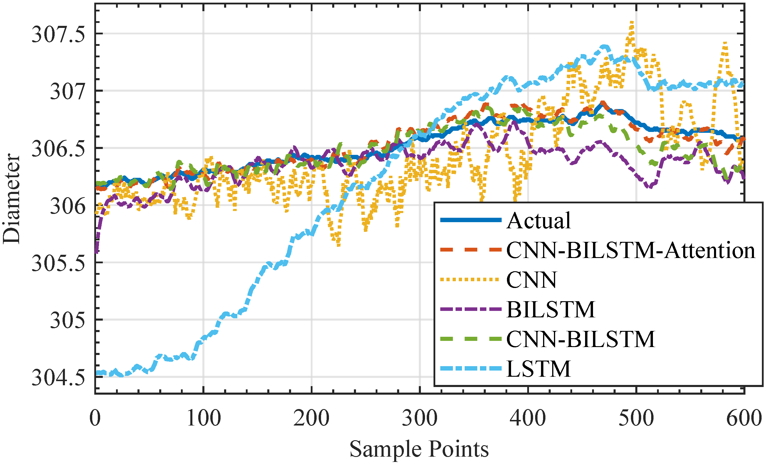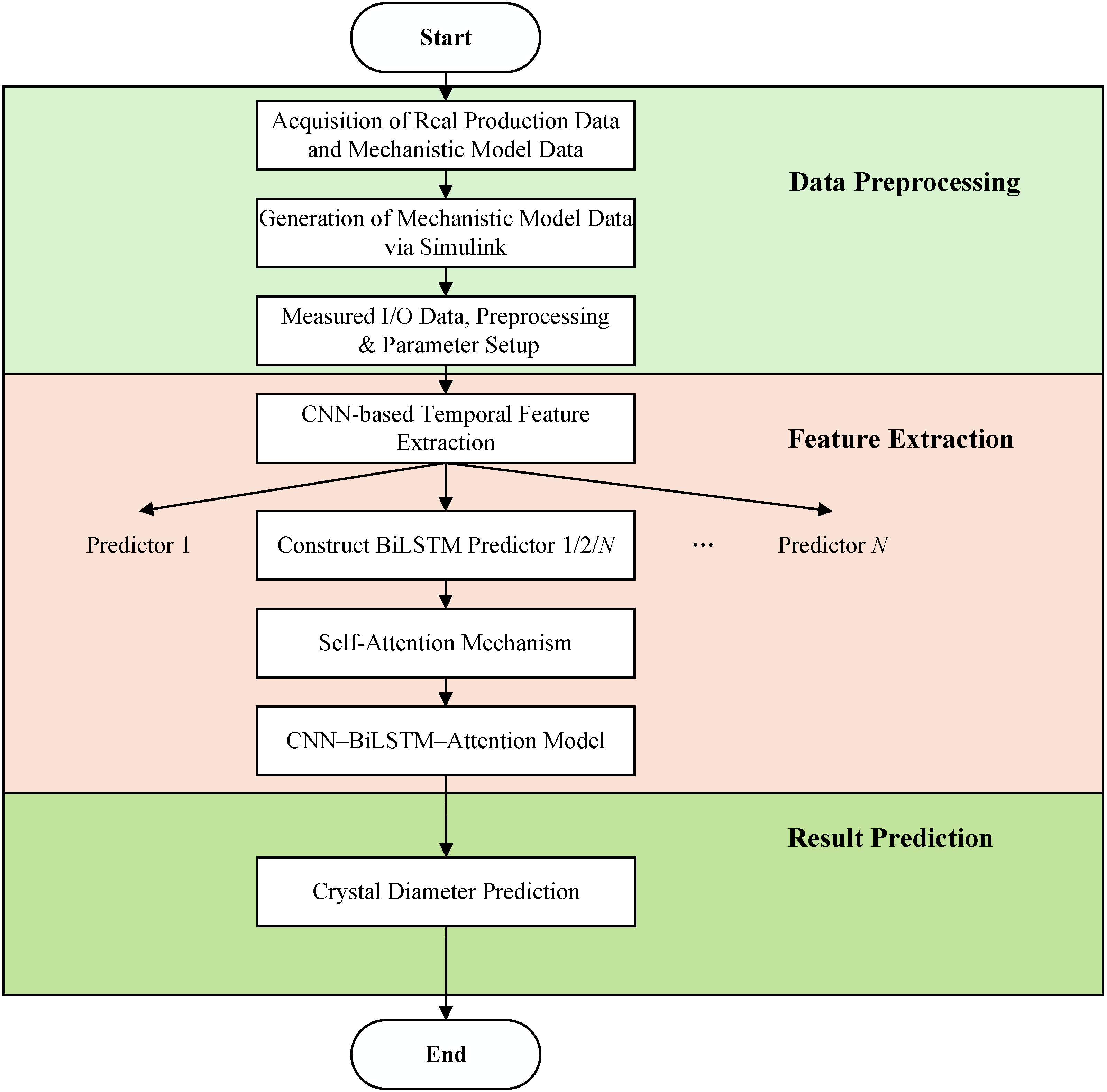 Chicago/Turabian StyleZhang, Pengju, Hao Pan, Chen Chen, Yiming Jing, and Ding Liu. 2026. "CNN–BiLSTM–Attention-Based Hybrid-Driven Modeling for Diameter Prediction of Czochralski Silicon Single Crystals" Crystals 16, no. 1: 57. https://doi.org/10.3390/cryst16010057