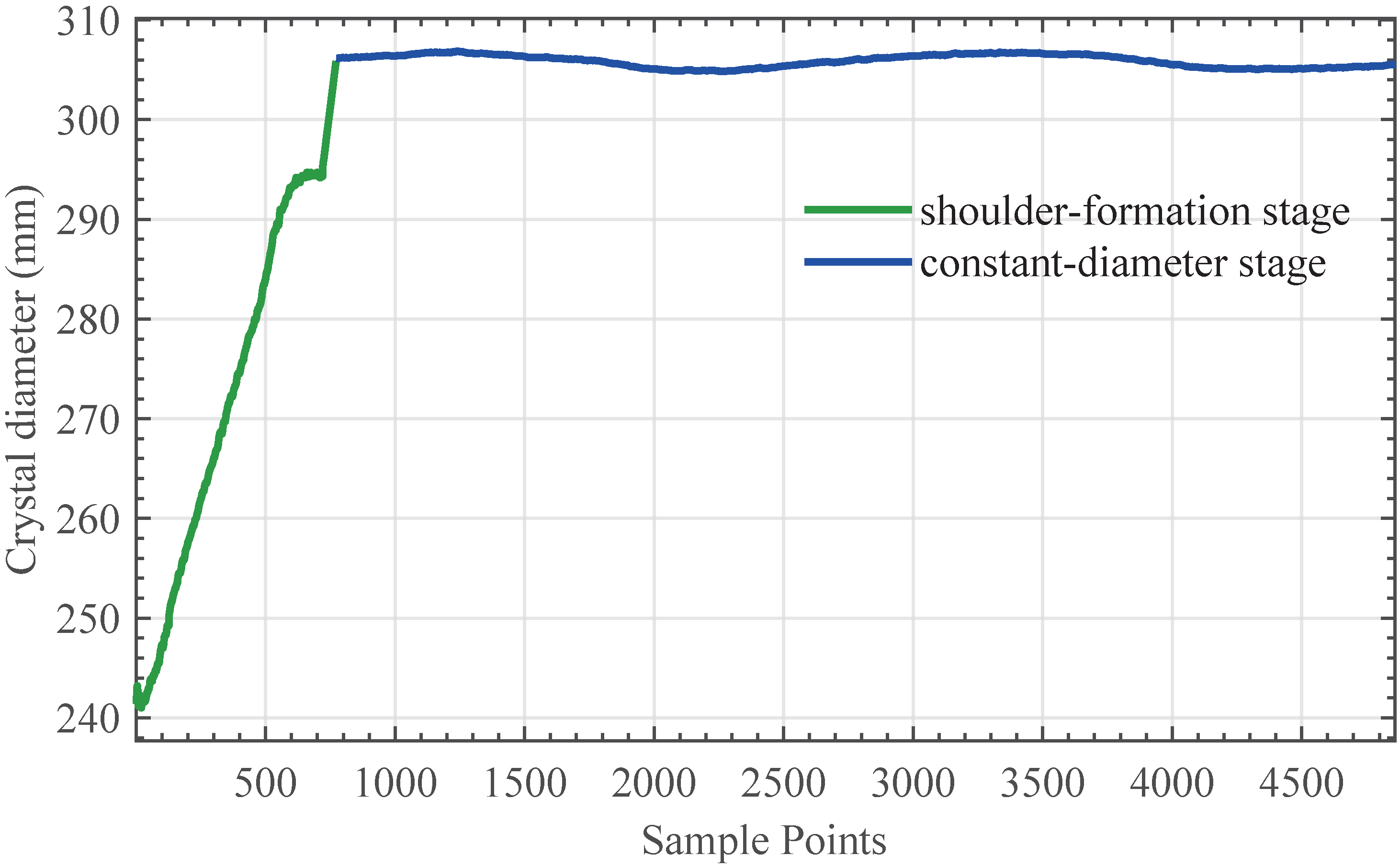 - Data acquisition: Shoulder-formation and constant-diameter stage data are collected both from actual CZ silicon single-crystal growth processes using an industrial furnace (TDR-180, National and Local Engineering Research Center of Crystal Growth Equipment and System Integration, Xi’an University of Technology, Xi’an, China) with a sampling interval of 2 s, covering the shoulder-formation and constant-diameter stages, and from crystal growth models constructed based on first principles under different operating conditions in multiple furnaces, in order to enrich the experimental sample dataset.