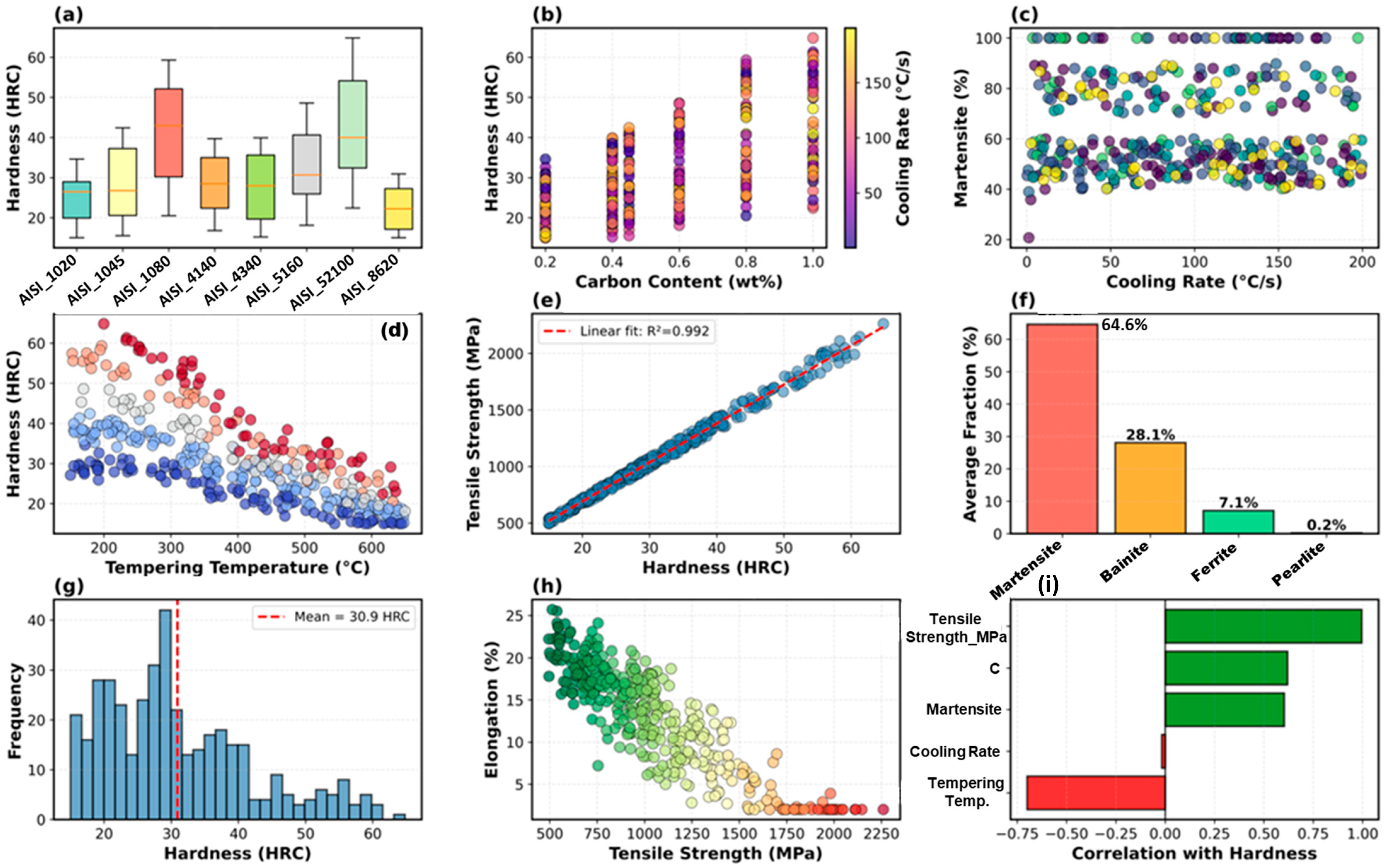 Physical consistency validation, which is rarely emphasized in ML studies, is essential for building trust in the results. The models satisfied monotonicity (hardness increases with carbon at fixed cooling, R2 = 0.97), appropriate limits (martensite > 95% for C > 0.3% at severe quench), and literature benchmarks (1.8% mean error versus ASM Handbook). Such validation transcends statistical metrics, detects dataset artifacts, and enables safer extrapolations. Future materials informatics should standardize the reporting of physical consistency, alongside R2 and RMSE. The learning curves reveal property-dependent data requirements. The hardness and strength properties plateaued at the 60% dataset (n ~ 144), suggesting 150–180 samples are sufficient for robust development and reducing the experimental burden by 40% compared to the full 400-sample program. The elongation and phase fractions showed non-converging curves, indicating the benefits of larger datasets (>400) or additional features capturing microstructural details (dislocation density and carbide morphology). These insights inform the experimental design of hybrid synthetic-experimental approaches. This study had some limitations. Phase transformation modeling uses simplified critical cooling rates to approximate complex TTT/CCT behavior. Although CALPHAD-based kinetic databases would improve accuracy, they require commercial licenses. A 400-sample synthetic dataset was generated using stratified random sampling to ensure equal representation across eight steel grades (50 samples each) and a balanced distribution across the cooling rate regimes and tempering categories. However, this intentional parameter decorrelation differs from industrial heat treatment datasets, where processing variables are often coupled through equipment constraints. For example, industrial furnaces may exhibit a correlation between the tempering temperature and time (higher temperatures are typically paired with shorter times for equivalent tempering parameters), or the cooling rate and quench temperature may couple in specific quenchant systems. Our synthetic approach intentionally varies the parameters independently to enable robust machine learning model training across the full parameter space. This design choice facilitates interpolation predictions but may reduce the direct transferability to facilities with strongly coupled parameters. For such applications, we recommend supplementing synthetic data with facility-specific experimental samples that capture the actual parameter coupling patterns. Property correlations assumed phase-weighted hardness without explicit modeling of dislocation density, carbide morphology, or retained austenite effects.