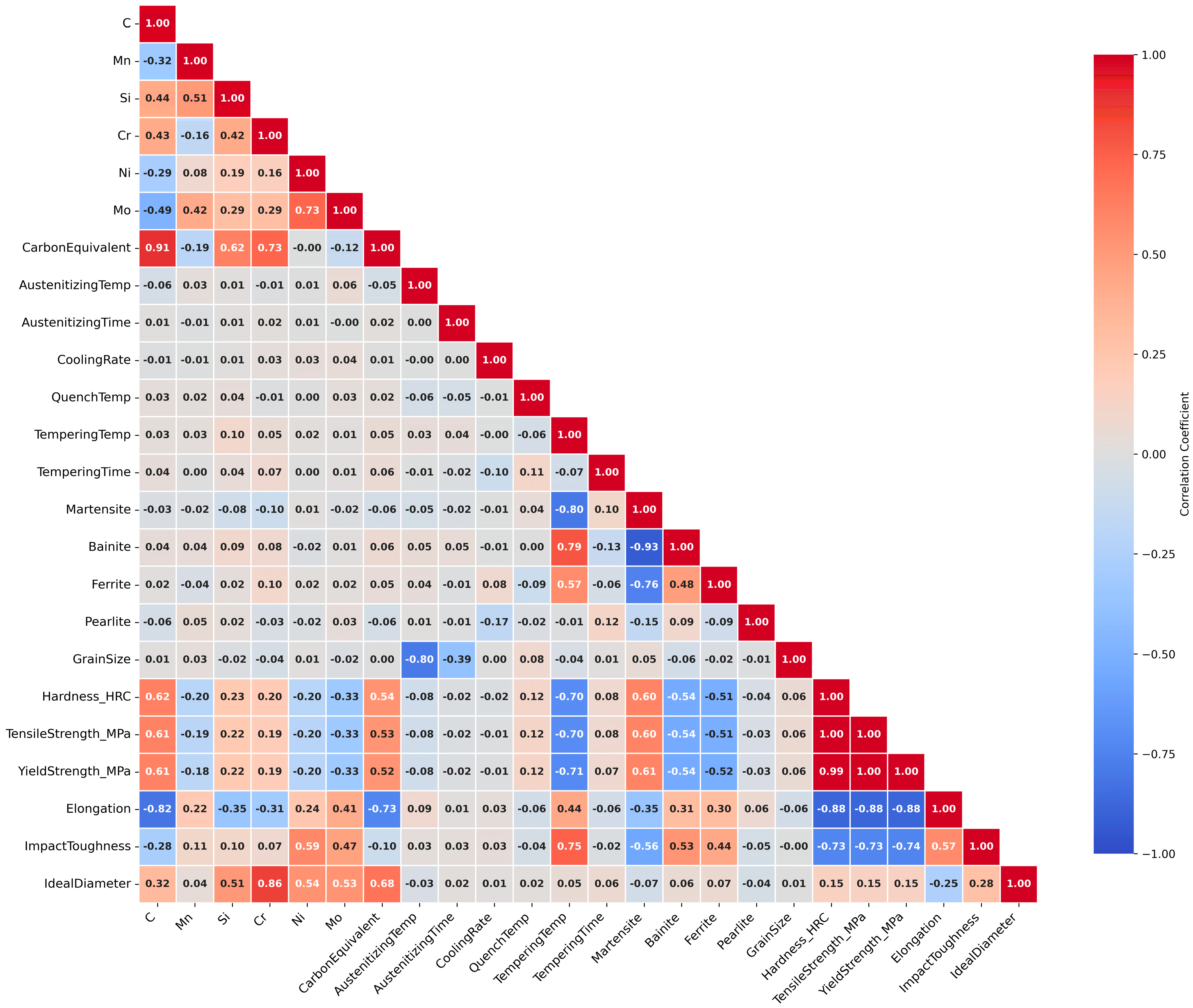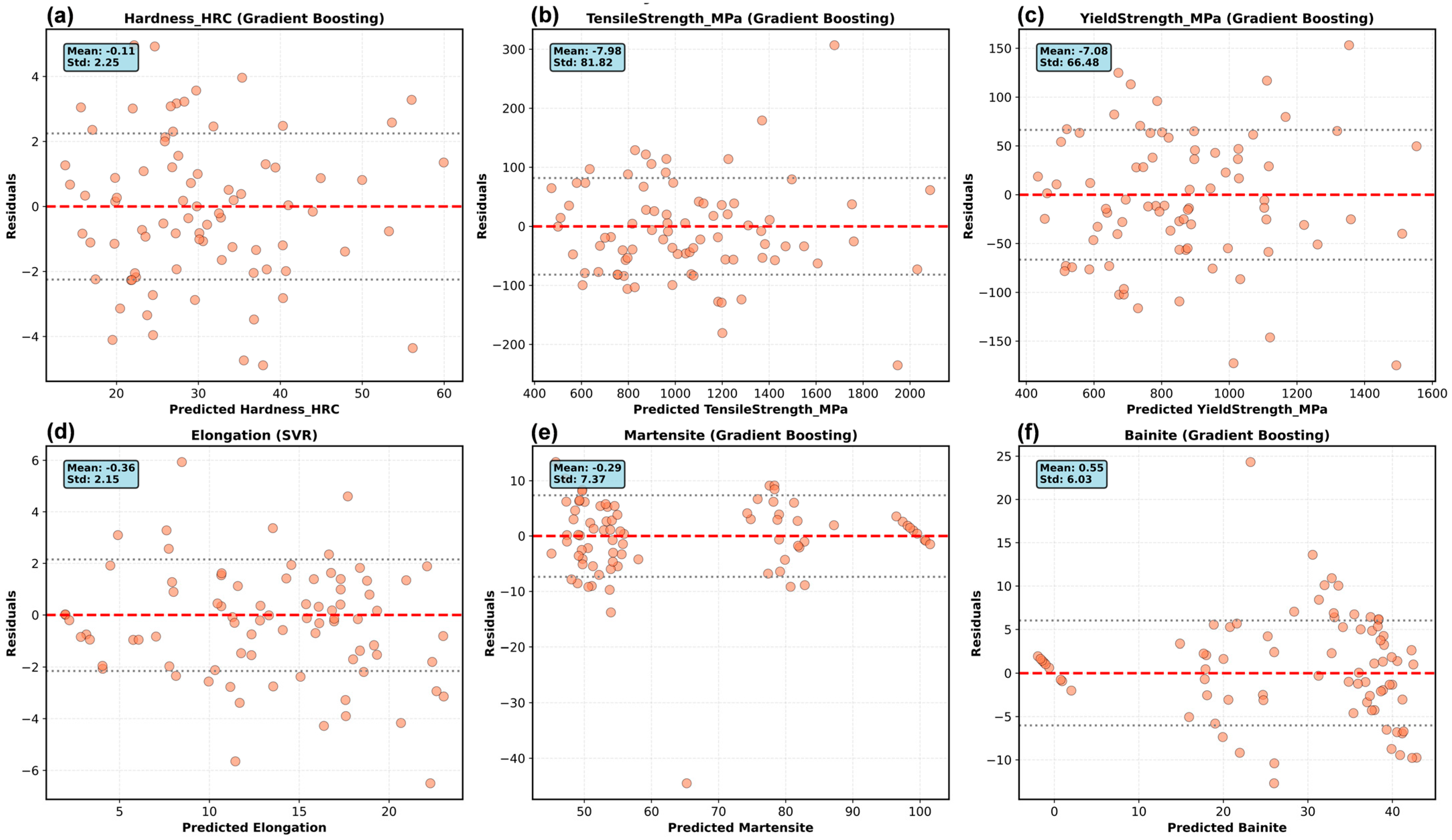 2 > 0.93 for the primary mechanical properties, with prediction errors (hardness of 2.38 HRC and 88 MPa tensile strength) within the typical experimental measurement uncertainty. This performance matches or exceeds recent ML studies using experimental data. Xiong et al. [
