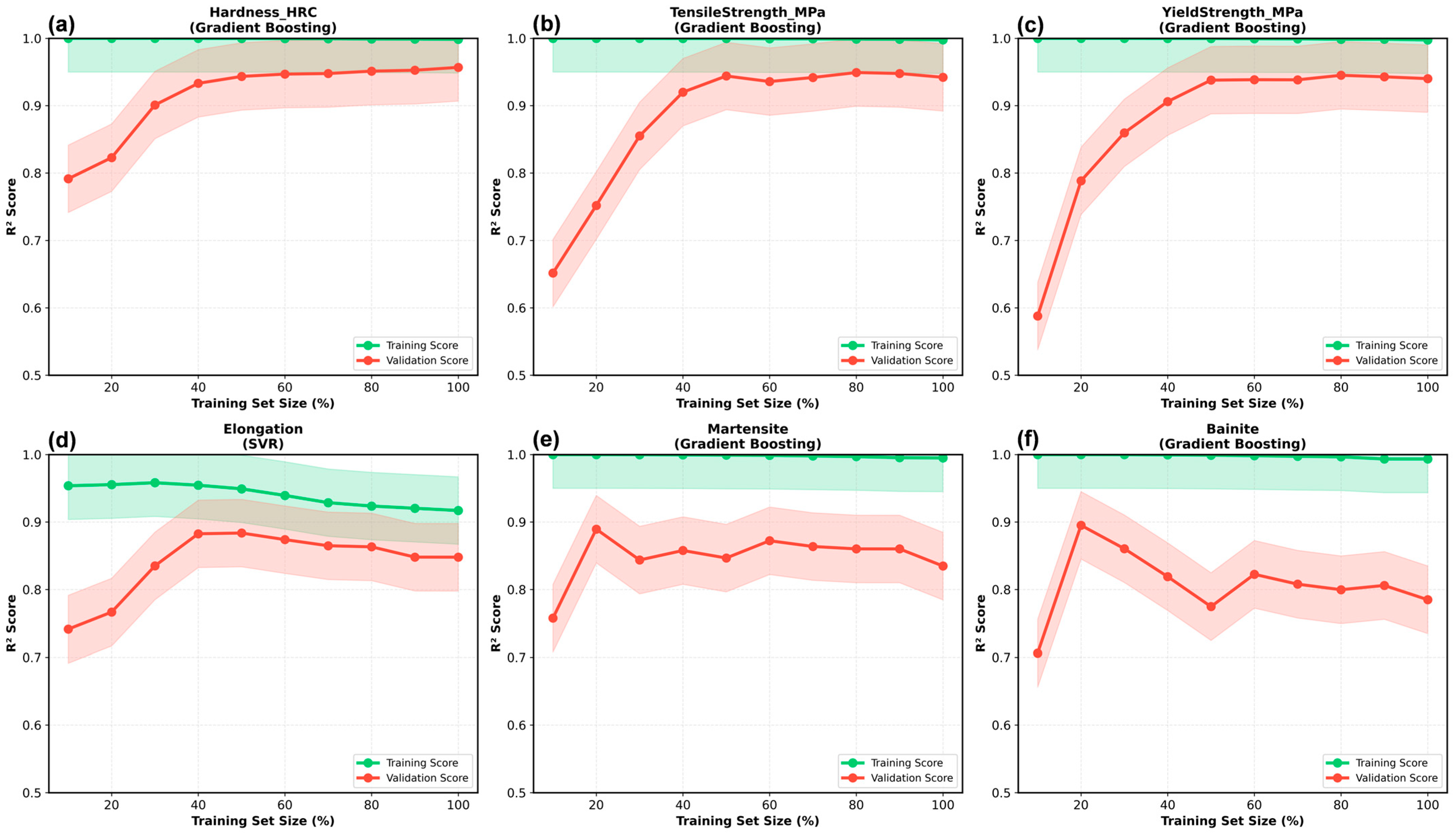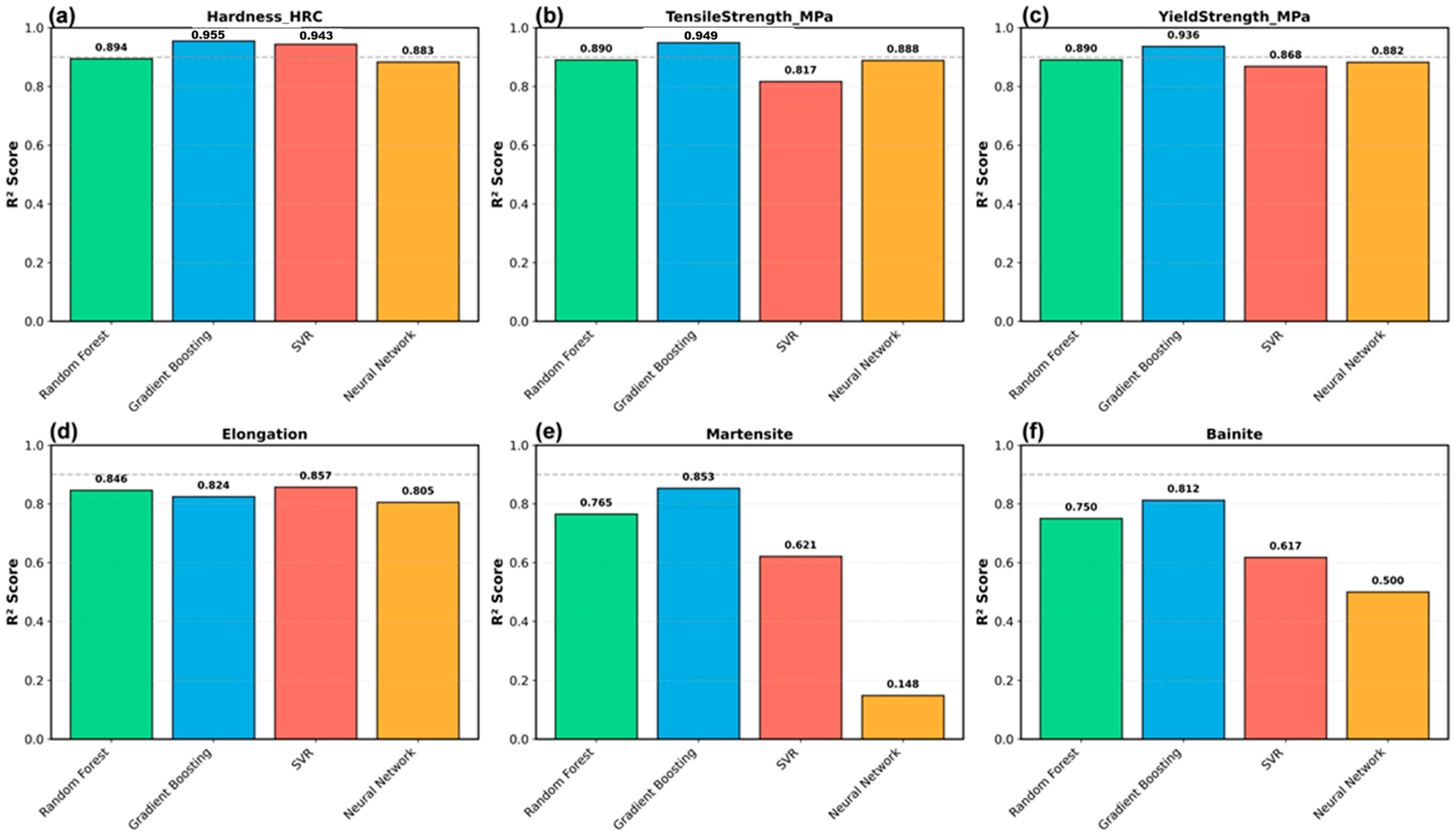 15]. Zhang et al. employed gradient boosting on 950 high-strength low-alloy (HSLA) steel samples and obtained R