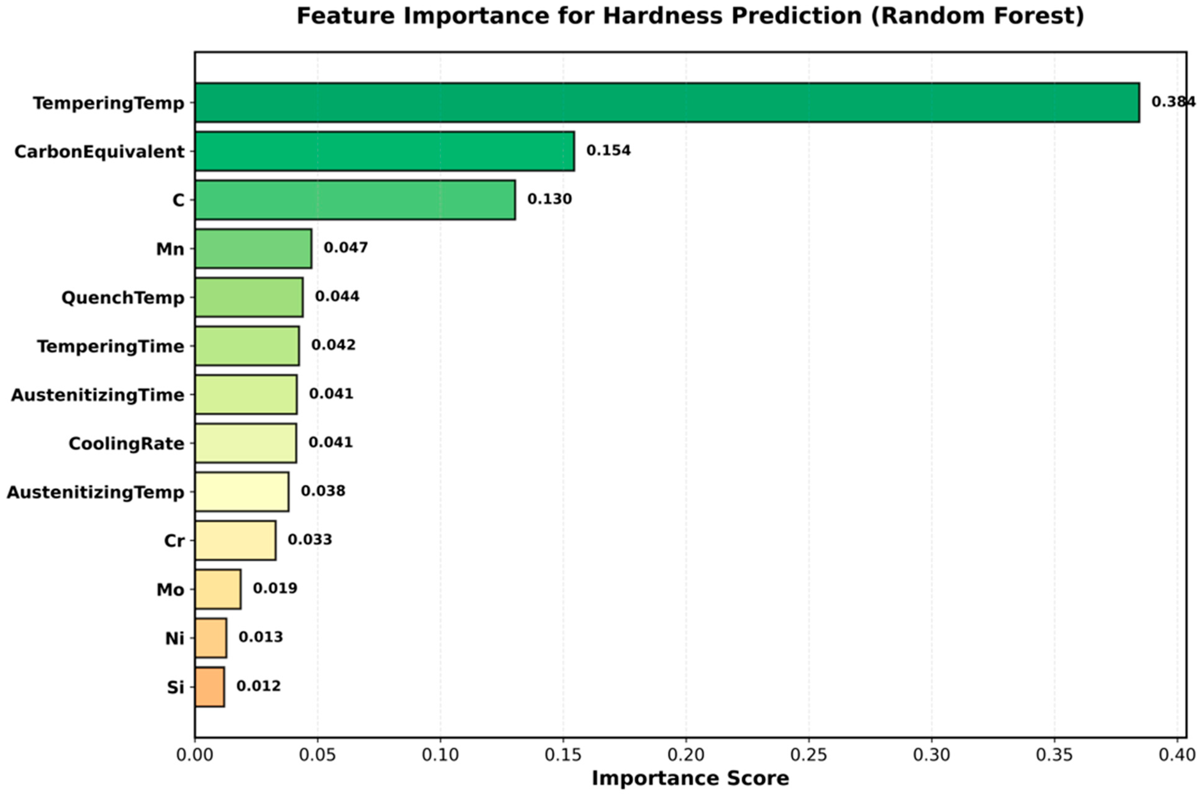 42]. Processing idealized uniform austenitizing and constant cooling rates; real components exhibit through-thickness gradients, requiring finite element thermal modeling integration. These limitations suggest that the current models are suitable for laboratory samples with controlled processing, and industrial component prediction must be coupled with process simulation software. The processing model assumes spatially uniform austenitizing and constant cooling rates throughout the component cross-section, which represents significant idealization compared to real industrial components. Large parts (>30 mm diameter) experience through-thickness thermal gradients during both heating and cooling: surface regions austenitize and quench faster than core regions, producing hardness gradients of 8–15 HRC between surface and center in 50–100 mm diameter cylinders. Our current framework cannot predict such gradients without integrating finite element heat transfer modeling to calculate local thermal histories as a function of position. This limitation restricts the direct applicability of the model to: (1) laboratory samples (<15 mm thickness) where thermal gradients are negligible, (2) induction-hardened components where only surface layer transformations matter, and (3) preliminary screening applications providing average property estimates. For industrial component prediction requiring through-thickness property distributions, we recommend coupling our ML models with commercial heat treatment simulation software (e.g., DANTE, SYSWELD) that provides location-specific thermal histories as inputs to property prediction models [