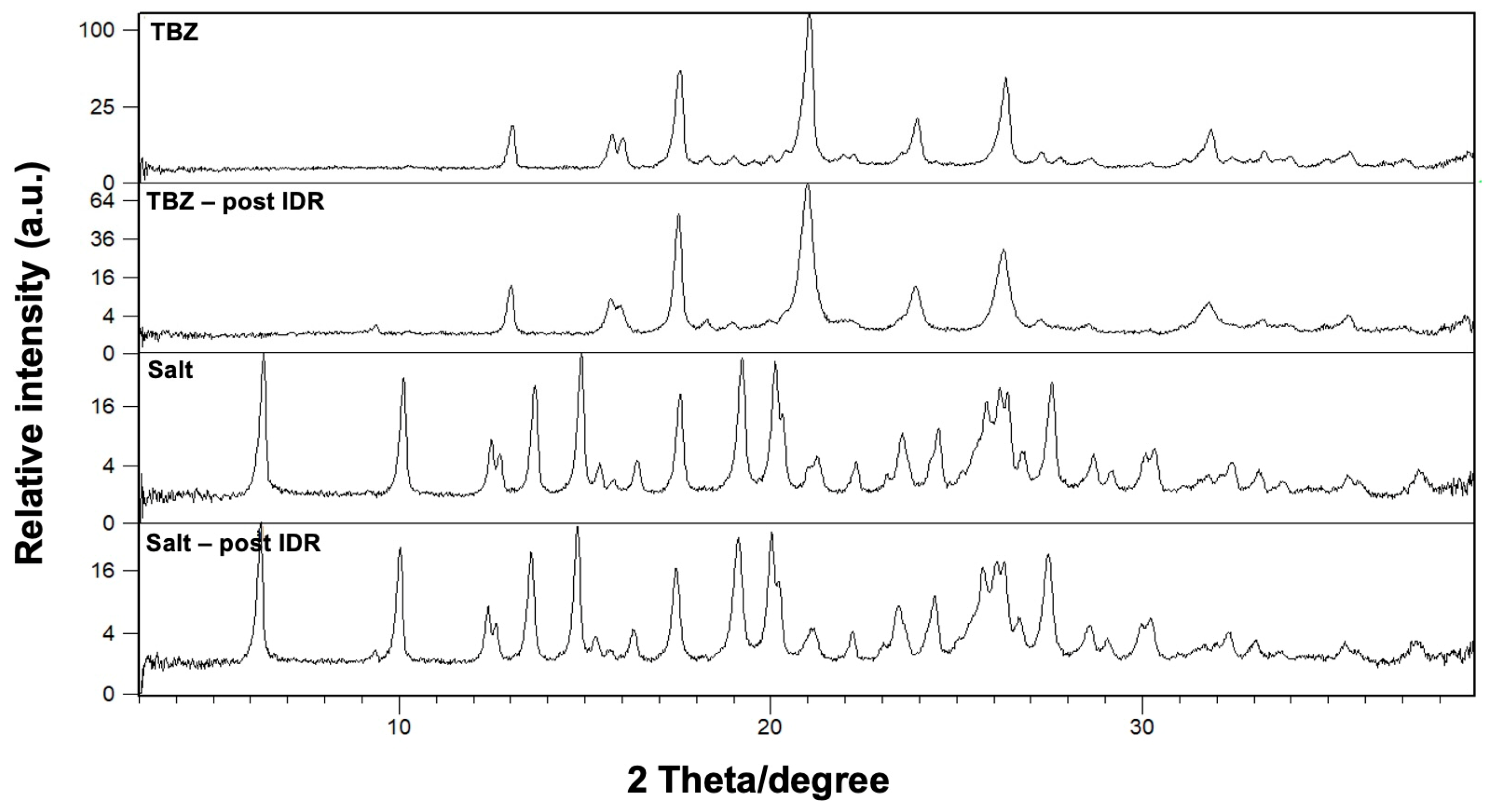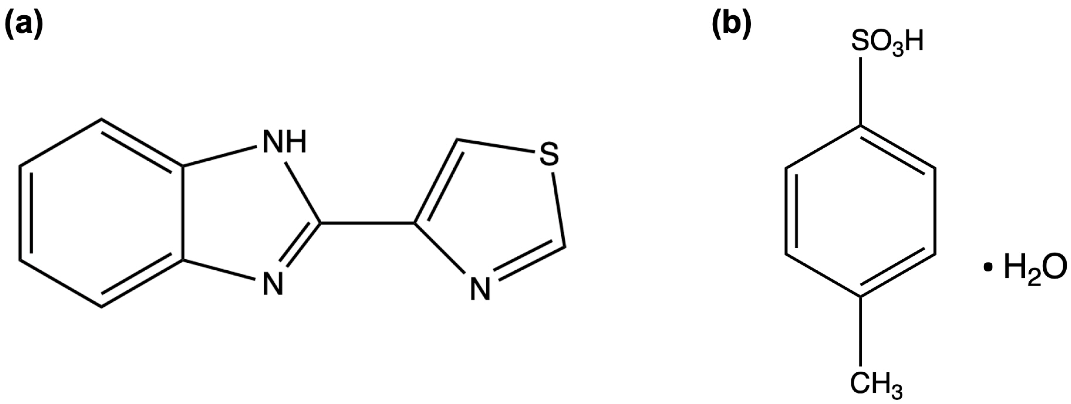 - Aeindartehran, L.; Lefton, J.B.; Burleson, J.; Unruh, D.K.; Runčevski, T. Soluble Thiabendazolium Salts with Anthelminthic Properties. Int. J. Pharm. 2023, 647, 123516. [Google Scholar] [CrossRef]