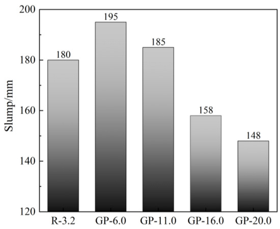 The workability of fresh concrete was measured by the flow table test. It can be seen from Figure 3 that the slump of concrete was significantly affected by GP content, which first increased and then decreased with increasing GP, accompanied by clear changes in the cohesion and water retention of fresh concrete, which is consistent with the experimental results of other researchers [4,30]. GP-6.0 had the best fluidity, with a slump value 15 mm higher than that of R-3.2. But this slump value exceeds the designed range of (160 ± 30) mm. When GP content reached 11.0%, although the slump of fresh concrete decreased compared to GP-6.0, it was almost equal to that of R-3.2, and it had better cohesiveness and water retention. When GP content further increased to 16.0%, the slump of fresh concrete decreased by 12.2% compared to R-3.2. When GP content reached 20.0% and superplasticizer content was 1.2%, the mixture had already exhibited excessive viscosity, which would make construction difficult, although it satisfied construction requirements.