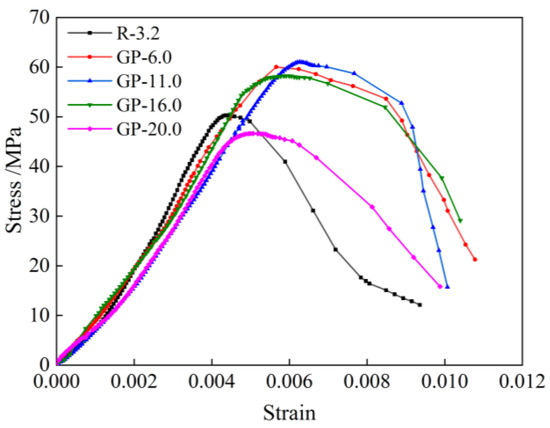Figure 4 shows the stress–strain curves of nuclear power concrete under compression at 28 d. It can be seen that with GP content increasing from 3.2% to 11.0%, the peak strain of concrete gradually increased, indicating an improved plastic deformation capacity and a decrease in the elastic modulus. However, it decreased when GP content increased from 11.0% to 20.0%, which may be related to the deterioration of the concrete microstructure caused by excessive GP content. For GP-6.0 and GP-11.0, the stress–strain curves of GP6 and GP11 are very similar, with comparable peak strains. From the perspective of saving aggregates and fully utilizing GP resources, it was reasonable to believe that GP-11.0 had better compressive deformation capacity.