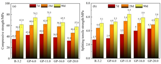 Compressive and splitting tensile strength of concrete with GP content: (a) compressive strength; (b) splitting tensile strength.