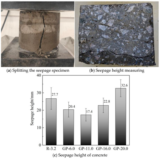 According to GB/T 50082-2024 [32], the impermeability of nuclear power-manufactured sand concrete was measured using the “Test method for gradual pressure loading”. That is, water pressure is applied from 0.1 MPa and increases by 0.1 MPa every 8 h until either (1) three out of six test specimens exhibit water leakage or (2) the specified water pressure is reached and the number of leaking specimens does not exceed three. In this study, when GP content varied between 3.2% and 20.0%, nuclear power-manufactured sand concrete always met the P8 requirement. Concrete specimens were split (shown in Figure 6a) after water pressure was maintained at 0.9 MPa for 8 h and then the seepage heights of 4~6 specimens without water infiltration were measured, as shown in Figure 6c, where each point represents the average value of 24~36 points because six points are taken from each specimen.