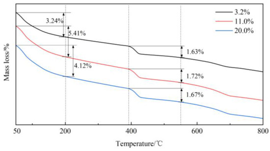 Hydration products of cementitious systems will decompose and cause weight loss at a certain temperature. It is feasible to determine the substances and their contents through thermal analysis. Figure 7 shows the thermogravimetric (TG) curves of concrete for 28 d. It can be seen that the dehydration of the C-S-H gel and AFt occurs at 40~200 °C, and the dehydration of Ca(OH)2 occurs at 390~530 °C. When GP content is 3.2%, 11.0%, and 20.0%, the mass losses are 3.24%, 5.41%, and 4.12% at 40~200 °C, and the mass losses are 1.63%, 1.72%, and 1.67% at 390~530 °C, respectively. The maximum mass loss of two types of dehydration occurred when the GP content was 11%. That is, with the addition of GP, the hydration products C-S-H and AFt obviously increased, but there was little change in CH. Perhaps this was because SiO2 in GP can react with CH to generate more C-S-H, and then the reduction of CH promoted the hydration reaction continuously. However, due to its low activity, GP can only consume some CH, resulting in little change in CH in the cementitious system.