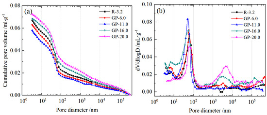 In order to study the effect of GP on the pore structure of nuclear power-manufactured sand concrete, an MIP test for concrete specimens with different GP contents aged for 28 days was analyzed. Table 4 and Figure 9 showed that the porosity of concrete first increased and then decreased with the increase in GP content, exhibiting a similar trend in slump, compressive strength, and splitting tensile strength, as shown in Figure 3, Figure 4, Figure 5 and Figure 6. When GP content increased from 3.2% to 11.0%, the porosity decreased by 13.50%, the median pore size decreased by 19.0%, the most probable pore size decreased by 21.0%, and the average pore size decreased by 38.53%. That is, when the GP content of manufactured sand was 11%, the pore structure of nuclear power concrete was significantly refined. When GP content reached 20.0%, the porosity increased by 26.7%, but the median pore size, average pore size, and the most probable pore size slightly decreased compared to those at 3.2%. In addition, when the GP content was 20%, the volume of capillary pores larger than 200 nm significantly increased compared to when GP content was 3.2% and 11.0%. As shown in Figure 9a,b, GP-16.0 and GP-20.0 have more pores in 1000~10,000 nm. GP-11.0 has a smaller cumulative pore volume and a smaller most probable pore size compared to GP-6.0, indicating that GP-11.0 has a finer pore structure.