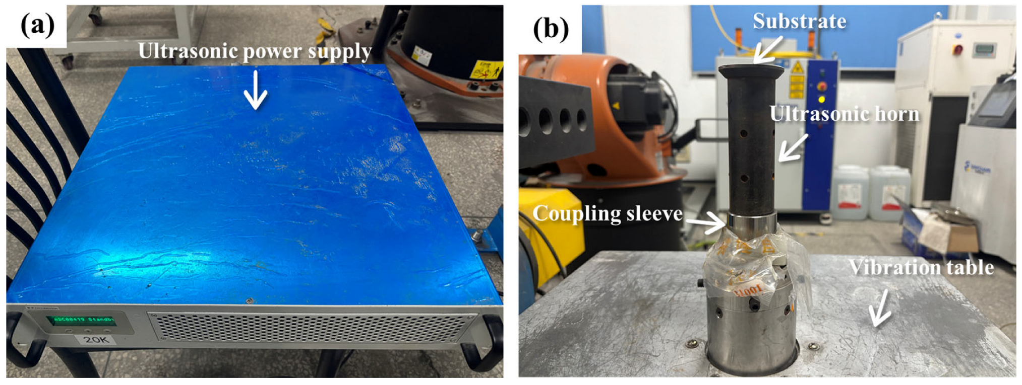 - Han, J.; Wang, S.; Ge, W.; Chen, H.; Sun, Y.; Ai, Y.; Yuan, W.; Ruan, S.; Niu, W.; Yang, H.; et al. Non-contact ultrasound to assist laser additive manufacturing. Nat. Commun. 2025, 16, 7613. [Google Scholar] [CrossRef] [PubMed]