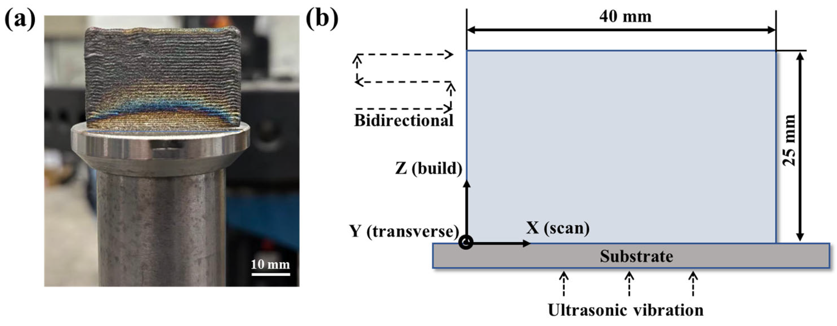 - Ning, F.; Hu, Y.; Liu, Z.; Wang, X.; Li, Y.; Cong, W. Ultrasonic vibration-assisted laser engineered net shaping of Inconel 718 parts: Microstructural and mechanical characterization. J. Manuf. Sci. Eng. 2018, 140, 061012. [Google Scholar] [CrossRef]
