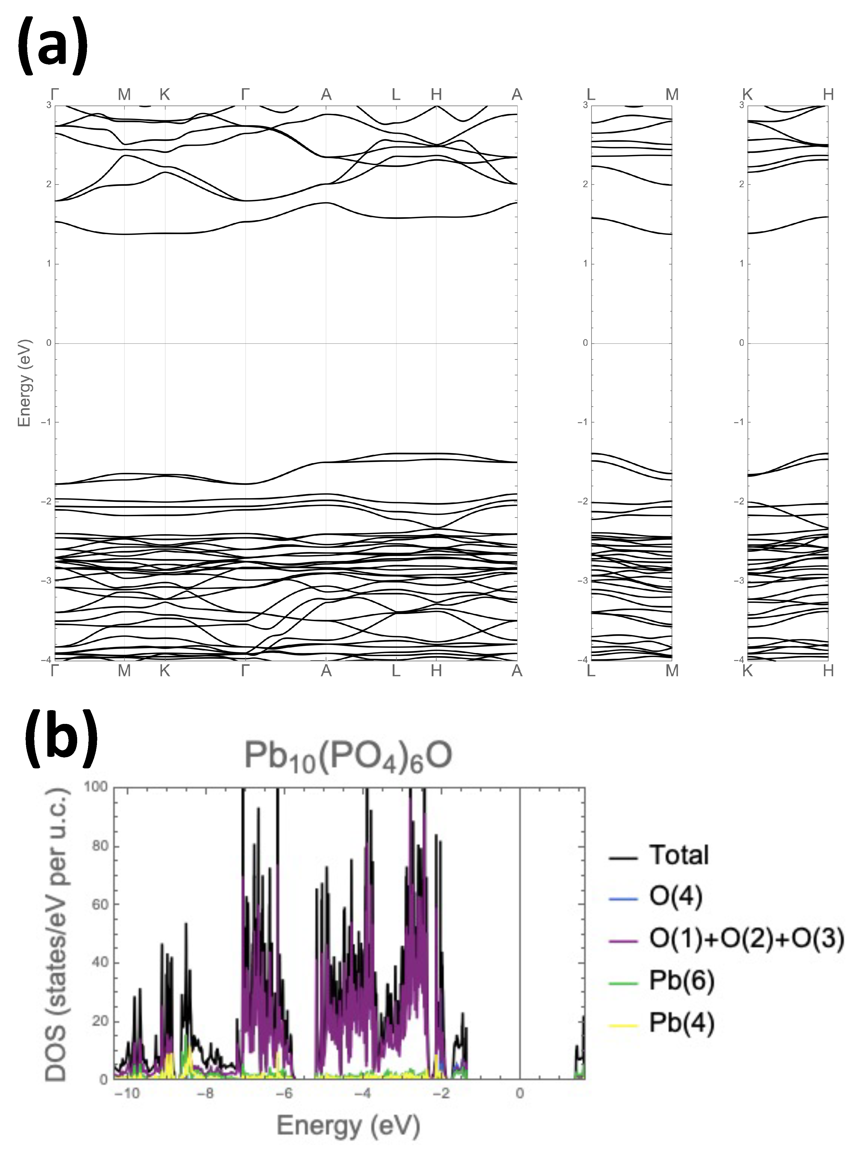 Figure 2. Electronic structure of parent compound Pb10(PO4)6O. (a) Band dispersion calculated along high-symmetry paths. (b) Density of states projected onto different atomic sites. We refer the energies to the Fermi level (consistently within the entire manuscript), which is placed in the middle of the gap. The gap width is equal to 2.765 eV.