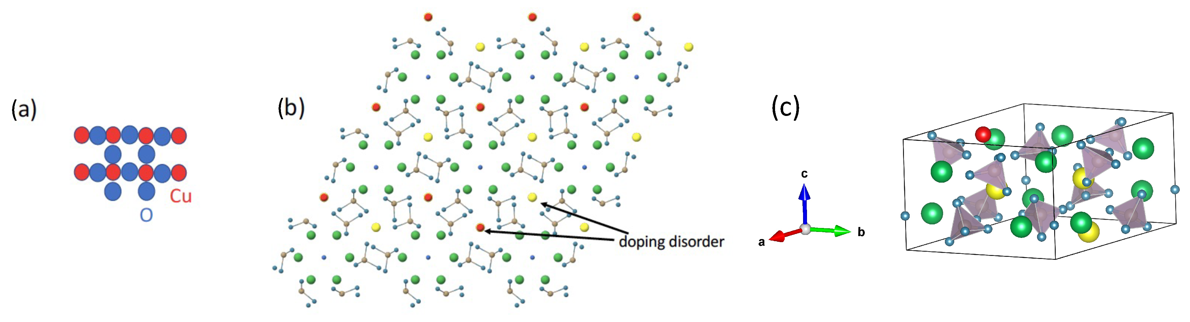 Figure 3. (a) Natural bond distances between Cu and O in a Cu-O sublattice, give a large bandwidth w 0 . (b) Top view projection of CuPb9(PO4)6O focusing on the Cu sites (red) which are substituted on 1/4 ( 1/2 in this view) of the four-fold Pb(4f) sites (yellow), the blue O(4) atoms that will hybridize with the red coppers, and the six-fold Pb(6h) (green). Also shown at the bottom right is one example of doping disorder, where the Cu goes into the “wrong” Pb(4f) site. (c) shows a 41-atom unit cell in 3D with Cu at a selected Pb(4f) position after structural relaxation with no symmetry constraints. PO4 tetrahedra are shaded gray.