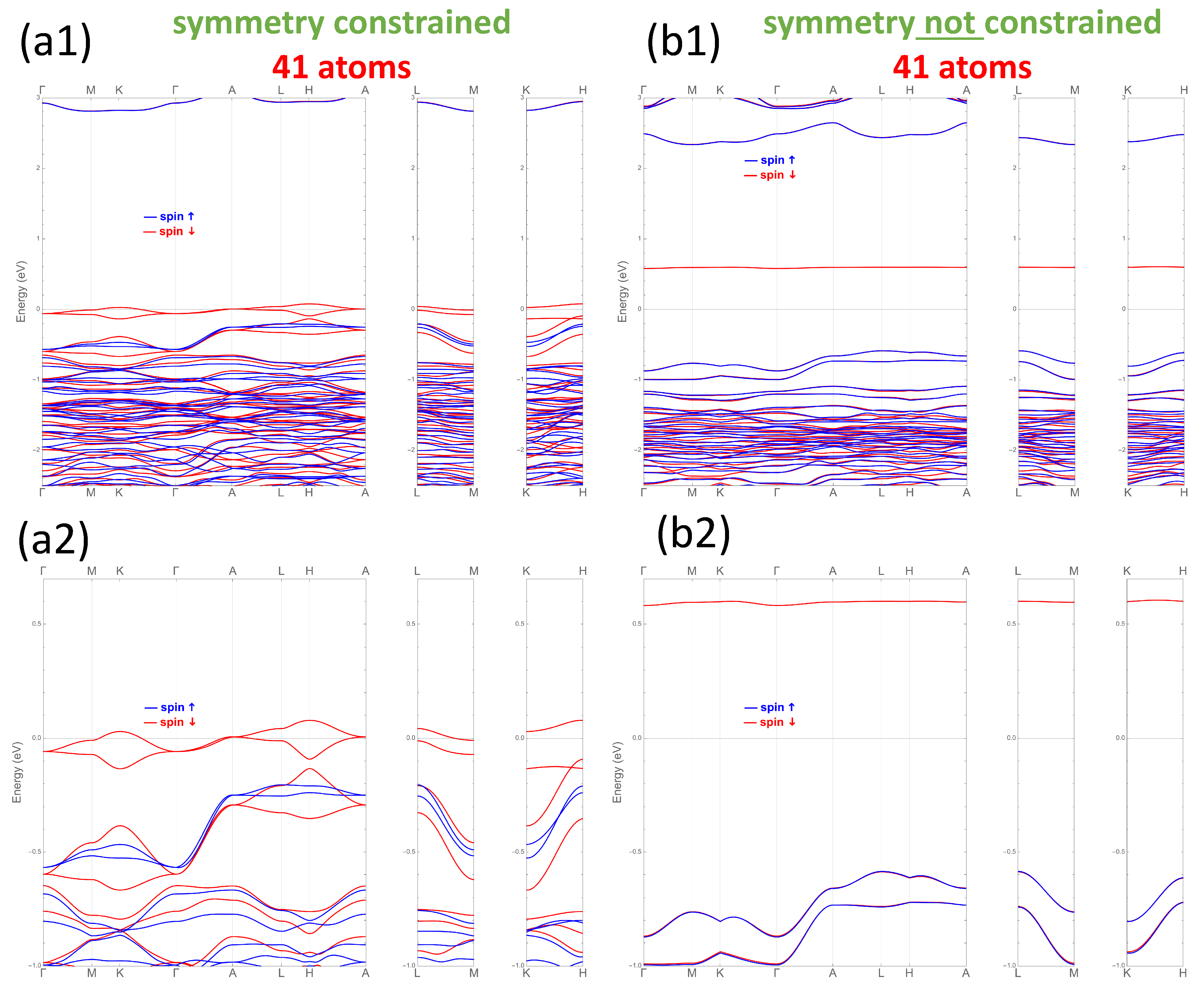 Figure 5. The band structure of CuPb9(PO4)6O associated with the DOS of Figure 4. Red and blue lines indicate “spin-down” and “spin-up” bands, respectively. (a1,a2) show the band structure obtained from P3 symmetry-constrained calculations. (b1,b2) show the band structure obtained from calculations without symmetry constraints imposed. Only results for 41-atom unit cells are presented. In the case of results presented in panels (b1,b2), we use the same path as for (a1,a2), ignoring the effects of the weak triclinic distortion.