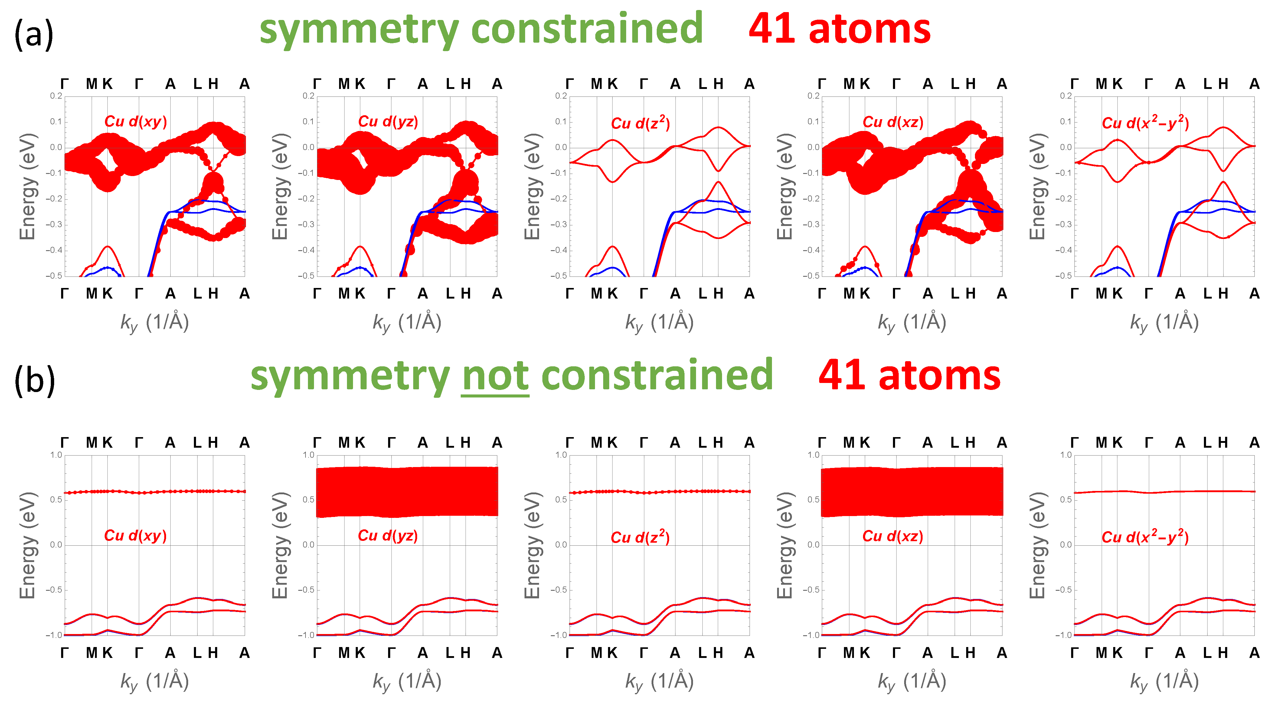 It is noteworthy that the unconstrained band structure in Figure 5b1 bears a strong resemblance to the many-body result obtained from QSGW theory, Figure 2d in Ref. [17]. In both cases the conduction band minimum consists of a nearly dispersionless minority Cu 3d state; only the gap is larger in the many-body case. Gap formation is a consequence of the general tendency in flat-band systems to open a gap, as noted in the introduction. In the DFT case, this is realized by structural symmetry breaking; in the many-body case, it is realized strictly through the electronic structure, through an orbital dependent potential.