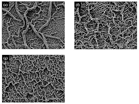 Scanning electron microscopy is used to describe the morphology of seven different types of ZnO thin films (Figure 1). The surface modifications of the films are readily visible in these micrographs. The surface morphology of the ZnO thin film formed from gel aged for 0 days (ZnO/0 d) was extremely smooth and covered in round grains, as shown in Figure 1a. In certain applications, producing extremely smooth surfaces is crucial, but not in photocatalysis. As a result, the movies were the least active. The surface morphology of another zinc oxide layer, which was not smooth, is shown in Figure 1b. The ZnO films (ZnO sol lasted 1 day, ZnO/1 d) had a structure that resembled ganglia under a scanning electron microscope. The morphology of the wrinkles was consistent. Their thickness, size, and shape were influenced by how long the original solution aged. As ZnO sol aged longer, the ganglia-like hills (Figure 1b–g) became bigger, more dispersed, and had branches at the ends. There were more wrinkles, and the morphology was consistent. The ganglia-like structure appeared to be reproducible regardless of annealing and film decomposition conditions. The sol aging process led to the formation of films with improved surface area and a more favorable pore distribution, which increased the number of active sites for catalytic reactions. Through controlled aging and subsequent thermal treatment, surface stabilization could be achieved (e.g., by the formation of HO-zinc oxide centers), which reduced the undesirable degradation of characteristics during subsequent use [40,41]. This was also supported by the specific surface area (BET) values (ZnO/0 d had 10.7 m2/g, ZnO/15 d had 13.8 m2/g, and ZnO/30 d had 16.3 m2/g). The aging process of the sol caused a slight increase in the surface area of ZnO, indicating an increase in the number of surface sites. This was probably due to the change in surface morphology resulting from the formation of more active sites.