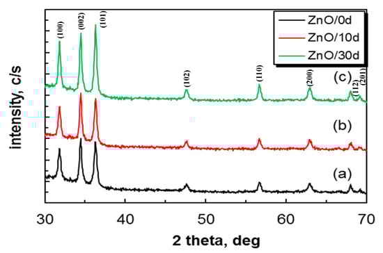 XRD pattern of the prepared (a) ZnO/0 d, (b) ZnO/10 d, and (c) ZnO/30 d thin films.