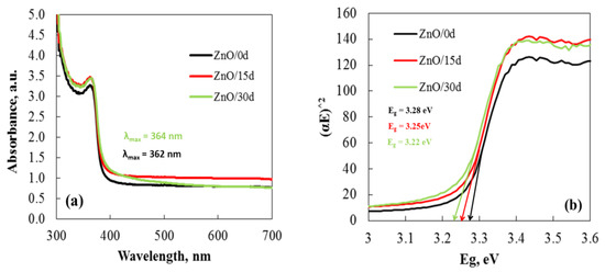 UV–vis absorption spectroscopy was used to examine the semiconductors’ optical characteristics. The ZnO/0 d film had an absorption band in the UV region at about 362 nm, as seen in Figure 4a. The ZnO/30 d sample, on the other hand, displayed a minor shift in the absorbance band (λmax = 364 nm) due to the sol’s aging duration. The transformation of the molecular precursor into oxide networks was the cause of this interaction. UV–visible absorption spectroscopy is a common approach for investigating materials’ optical properties. Figure 4b depicts the numbers obtained from the Kubelka–Munk extrapolation of the gel’s energy band gap. The calculated band gaps for the films were ZnO/0 d (3.23 eV), ZnO/15 d (3.19 eV), and ZnO/30 d (3.17 eV). It is worth noting that the band gap values decreased as the sol aged. Microstrain may increase in tandem with a decrease in the band gap (EG). A prior study discovered that strain could alter the interatomic spacing of semiconductors, influencing the energy gap value [47]. Our findings are consistent with other researchers’ findings that the optical band gap decreases as tensile strength increases [48,49]. Furthermore, Rao et al. [50] demonstrated that roughness had little effect on the optical properties of ZnO films. The band gap in ZnO film was not much influenced by roughness.
