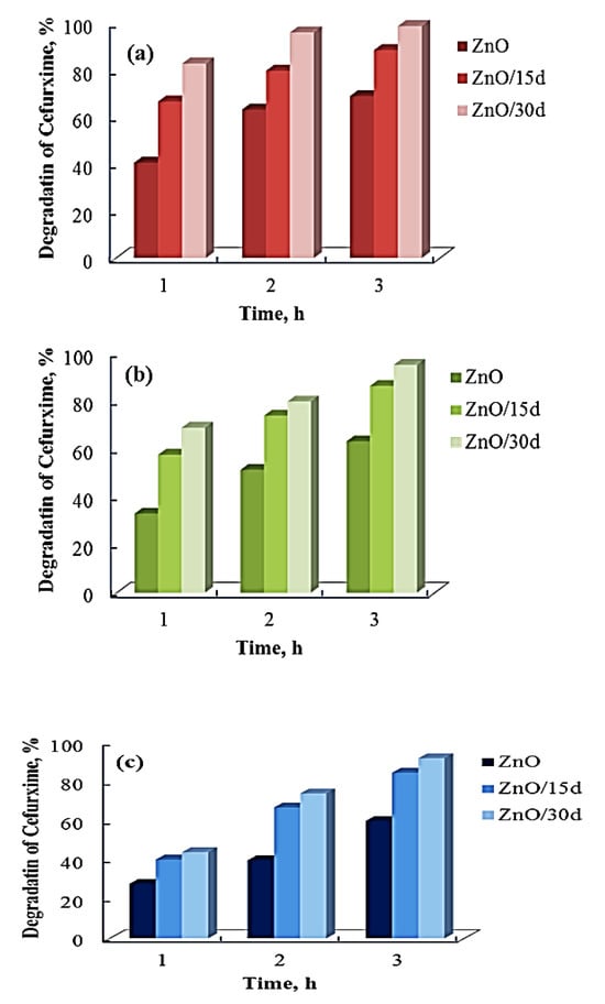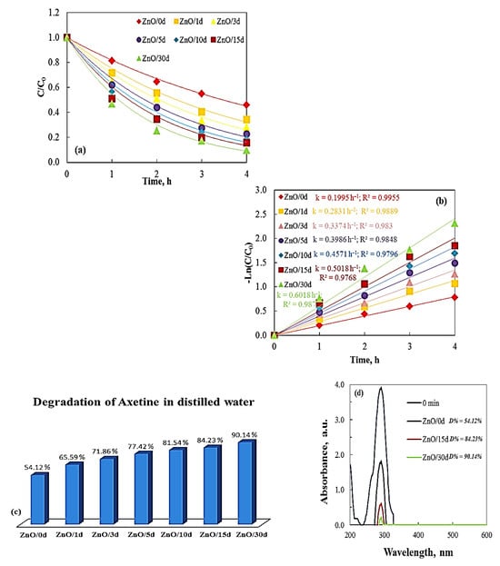 The calculated k values of sol–gel films, as well as the change in ln(C/C0) with irradiation time, are shown in Figure 6b. ZnO/30 d had a k value that was 3.07 times greater than ZnO/0 d in terms of xetine degradation. As a result, ZnO/30 d showed higher photocatalytic activity than ZnO/0 d. Figure 6c shows the proportion of Axetine degradation, which clarifies the constant values. Because photogenerated electrons and holes are known to stimulate the photocatalytic reaction, the response and transfer of photogenerated electron–hole pairs often depend on the photocatalytic activity of a catalyst. Cefuroxime degradation was tracked at 500 rpm using UV–vis spectroscopy, which was utilized to observe the absorption maximum at 290 nm. To determine the activity of the three types of ZnO films during the photocatalytic process, spectral changes in the degradation of the cephalosporin antibiotic were examined. The UV–vis spectrum and the percentage of axetine degradation are shown in Figure 6d.