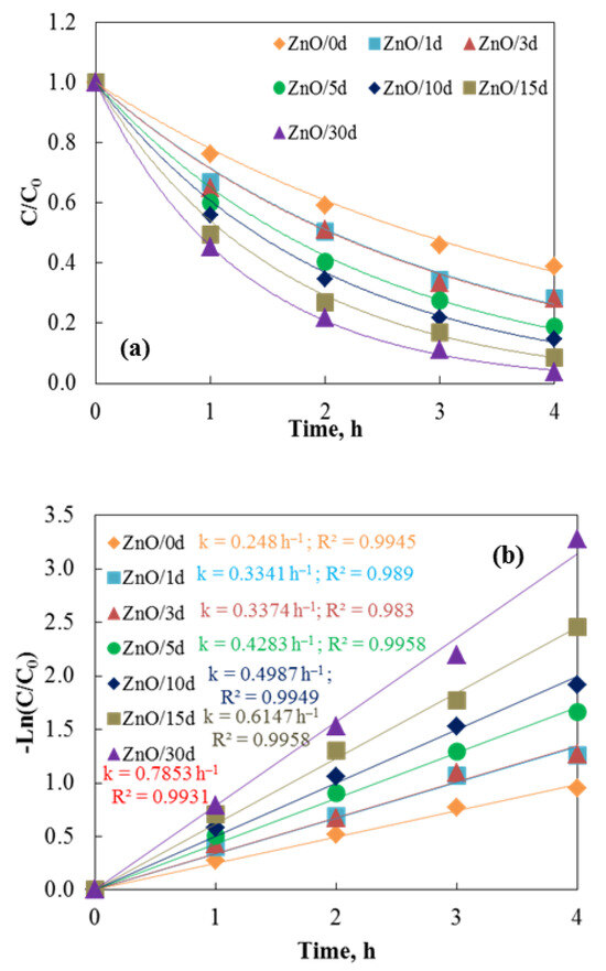 (a) Photobleaching of Cefuroxime in tap water by ZnO/0 d, ZnO/1 d, ZnO/3 d, ZnO/5 d, ZnO/10 d, ZnO/15 d, and ZnO/30 d thin films, (b) pseudo-first-order kinetic plot under UV light illumination.