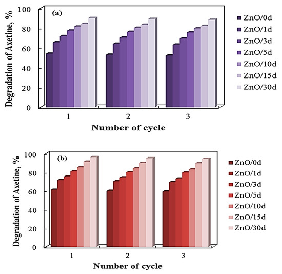 For photocatalysts to be used in environmental applications, they must have high photocatalytic properties throughout time. Therefore, photocatalytic tests were conducted under UV light to demonstrate the cycling stability of several types of catalysts for the degradation of cefuroxime in distilled and tap water. Figure 9 displays the findings of research on film regeneration and repurposing, demonstrating that catalytic quality steadily decreases with each cycle. The photocatalytic breakdown of xetine by the catalysts decreased by approximately 2% in both types of water after three cycles. Nevertheless, following three experimental cycles, the nanostructures derived from the 30-day-aged sol showed enhanced catalytic activity.