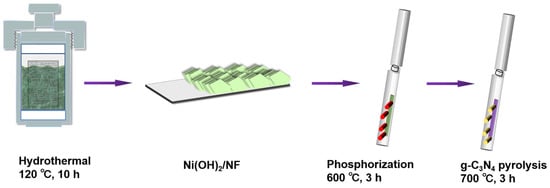 As presented in Figure 1, the typical preparation process of NC-coated NP/NF nanosheets can contain three main steps: (1) hydrothermal growth of Ni(OH)2 nanosheets on the NF; (2) in situ phosphidation of Ni(OH)2 nanosheets to form porous NiP nanosheets; and (3) in situ nitrogen-doped carbon-coated resulting NiP nanosheets to form NiP-NC with the interconnected porous conductive carbon framework. As for step 1, high quality Ni(OH)2 nanosheets with green color can be well grown on the surface of NF via a facile solvothermal approach. Figure S1 (Supplementary Materials) demonstrates that the crystal structure of the resulting product is a mixture of metal Ni (JCPDS No 65-2865) and Ni(OH)2 (JCPDS No 38-0715) [42,43], which is denoted as Ni(OH)2/NF. In the following phosphorization process, the diffraction peaks of Ni(OH)2 can disappear and weak peaks of Ni3P (JCPDS No 65-1605) can emerge, indicating that Ni(OH)2 can be completely transformed into the Ni3P crystal, and the as-obtained product is denoted as NiP/NF. Thereafter, a series of NCNPNF samples can be obtained via the carbon coating treatment with the NP/NF produced in step 2 with different amounts of g-C3N4 addition at 700 °C.