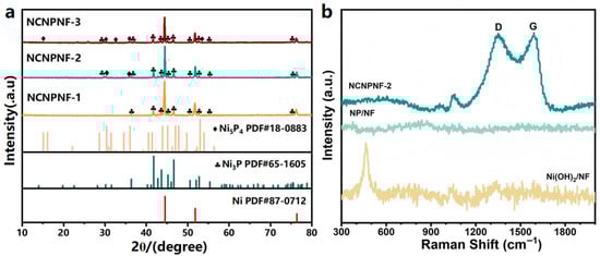 (a) XRD patterns of the prepared samples; (b) Raman spectra of Ni(OH)2/NF, NP/NF, and NCNPNF-2, respectively.