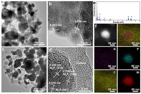 Typical TEM images of (a,b) NP/NF and (c,d) NCNPNF-2 sample (the lattice fringes in (d) show spacings corresponding to Ni4P5 and Ni3P planes). (e) EDX elemental spectrum and (f) mapping of N, P, C, and Ni of NCNPNF-2, respectively.