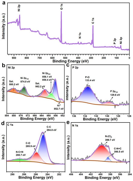 The elemental compositions and chemical states of NCNPNF-2 were measured by X-ray photoelectron spectroscopy (XPS). It is manifested from Figure 5a that the characteristic peaks of Ni, P, C, and N elements are observed in the survey spectrum, confirming the presence of the NiP and N-carbon in NCNPNF-2, which corresponds to the elemental mapping results. For the Ni 2p spectrum (Figure 5b), the peak located at 874.0 eV can be attributed to Ni 2p1/2, and the peaks at 858.4 eV and 856.1 eV can be indexed by Ni 2p3/2, respectively. The peaks at 862.2 eV and 880.2 eV are the corresponding satellite peaks, indicating the existence of the Ni2+ species, which arises from the inevitable surface oxidation when exposing the phosphide to air. Notably, the distinct peak observed at approximately 852.7 eV is assigned to metallic nickel (Ni0), confirming the presence of the NF substrate within the probed region. This multi-component Ni 2p signature—encompassing Ni0 and Ni2+ in phosphides and surface Ni2+ oxides/hydroxides—corroborates the complex phase composition revealed by XRD. As for the P 2p spectra in Figure 5c, the doublet with the P 2p3/2 peak at 129.6 eV is assigned to phosphide anions (P3−) in the nickel phosphides (Ni5P4-Ni3P). The peak at 133.4 eV originates from phosphorus in a pentavalent oxidized state (P5+, e.g., in phosphate species), likely formed due to surface oxidation [48,49]. The peaks at 284.8, 285.9, and 288.7 eV for C 1 s spectra in Figure 5d can be attributed to the strong C–C, C–O, and N–C=N from carbon-doped C [48], respectively. From Figure 5e, it can be observed that two peaks of N 1s at 399.8 eV and 398.4 eV can be assigned to the tertiary N bonded to carbon atoms (N–(C)3) and the sp2-bonded nitrogen in C–N=C, respectively, which illustrates that the N atom is incorporated into carbon [50]. Due to the disparity in size, bond length, and valence electrons, nitrogen-doped carbon can effectively induce a large number of defects in the carbon microstructure and increase the specific surface area to accommodate more ions, further forming more HER active centers, improving the performance of materials.