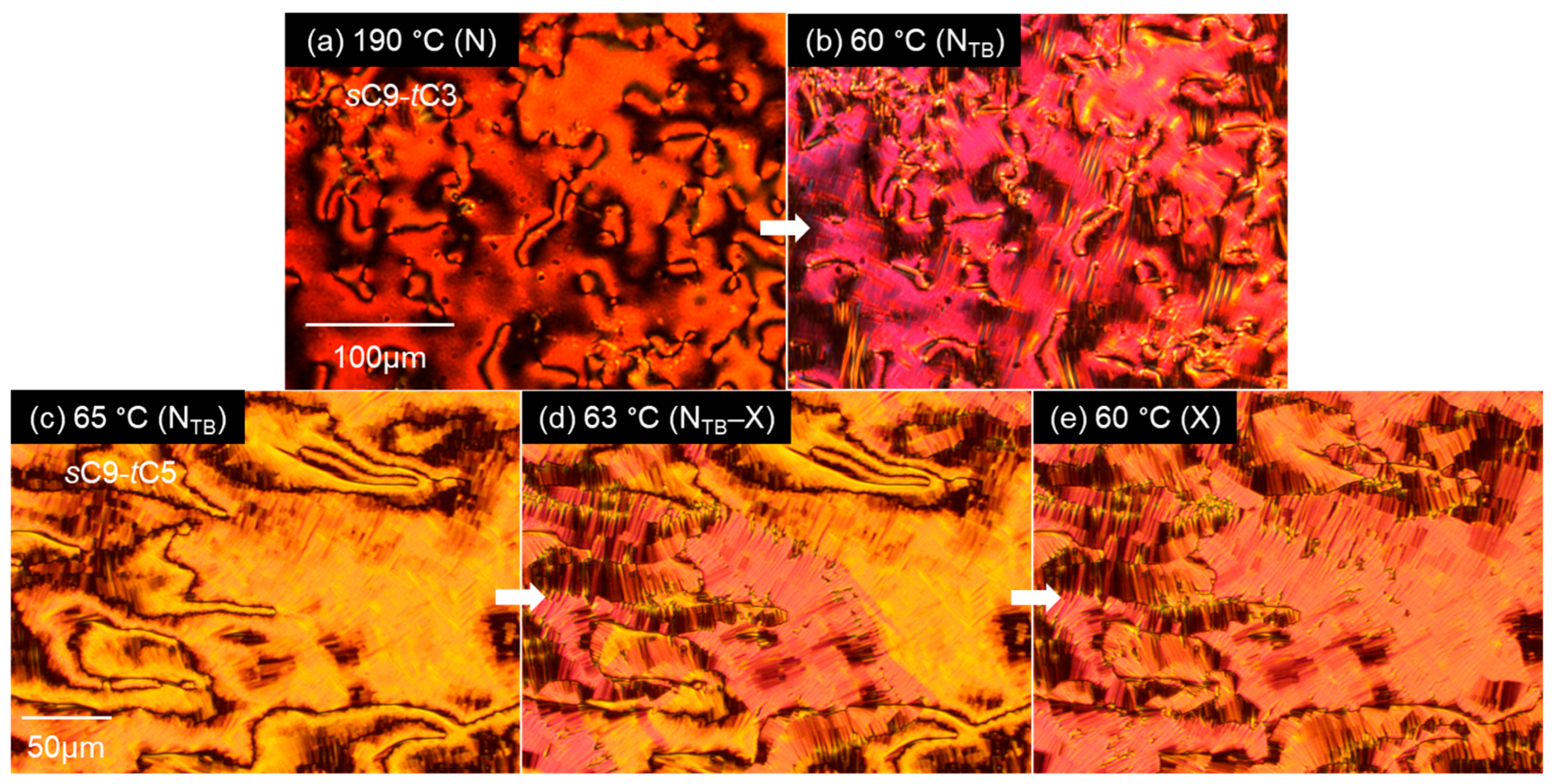 - Arakawa, Y.; Komatsu, K.; Shiba, T.; Tsuji, H. Phase behaviors of classic liquid crystal dimers and trimers: Alternate induction of smectic and twist-bend nematic phases depending on spacer parity for liquid crystal trimers. J. Mol. Liq. 2021, 326, 115319. [Google Scholar] [CrossRef]